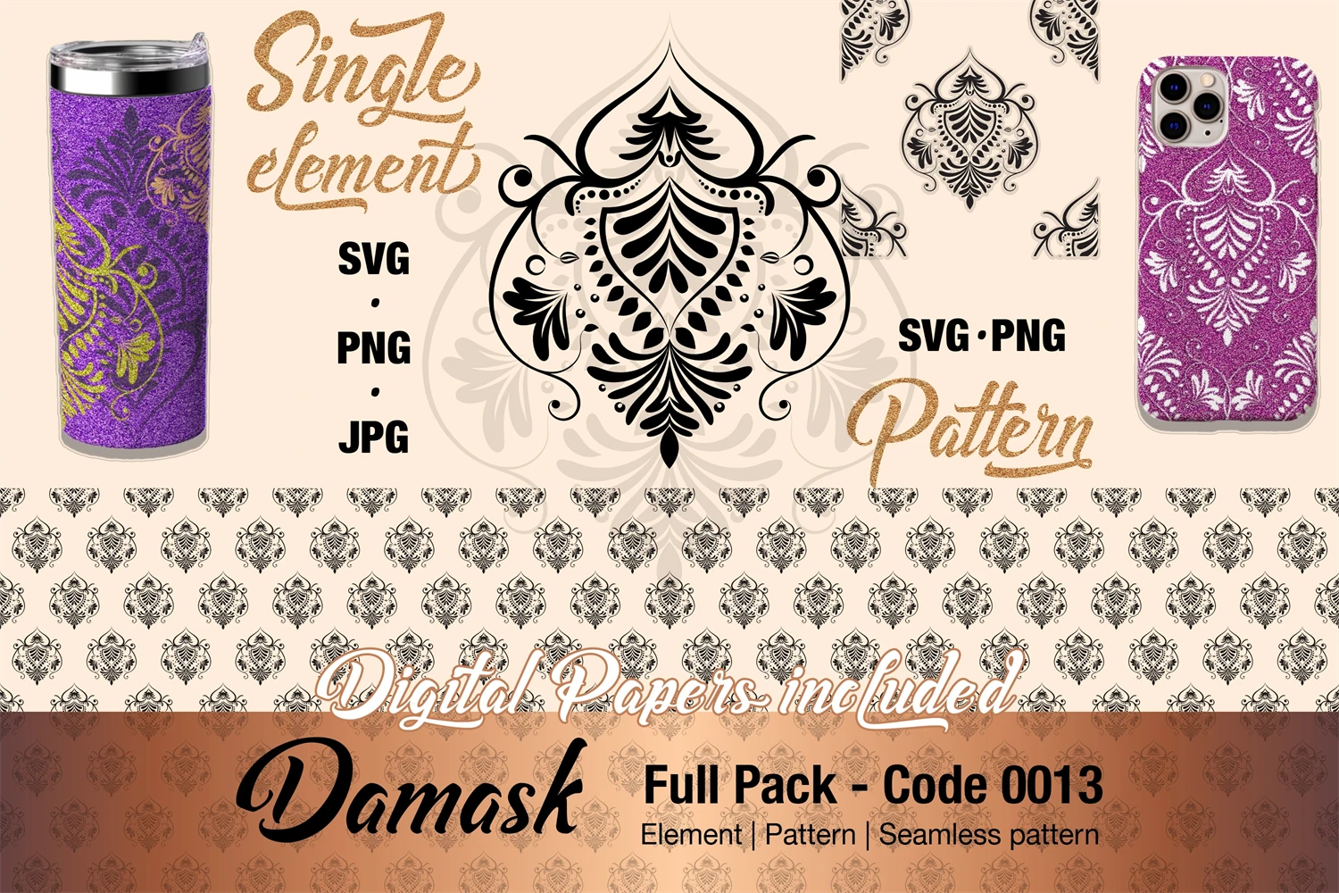 This complete package includes a single element for any graphic usage, a seamless pattern, and digital paper for ready use.