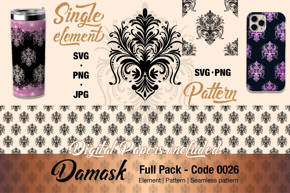 This complete package includes a single element for any graphic usage, a seamless pattern, and digital paper for ready use.