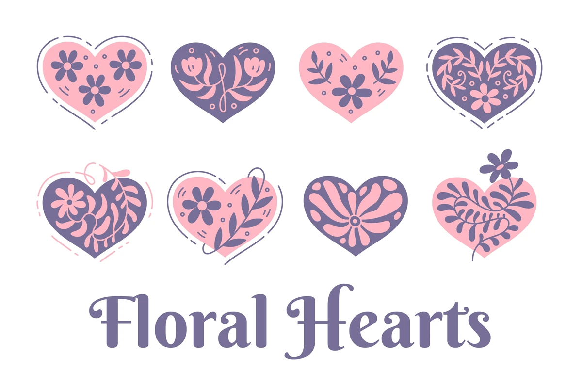 Cute hand-drawn pink hearts bundle with flowers, twigs and branches for Valentines day and Wedding design. Elegant floral hearts, decorated with botanical ornament. Pastel colored romantic collection. Love symbols set. Vector illustration.