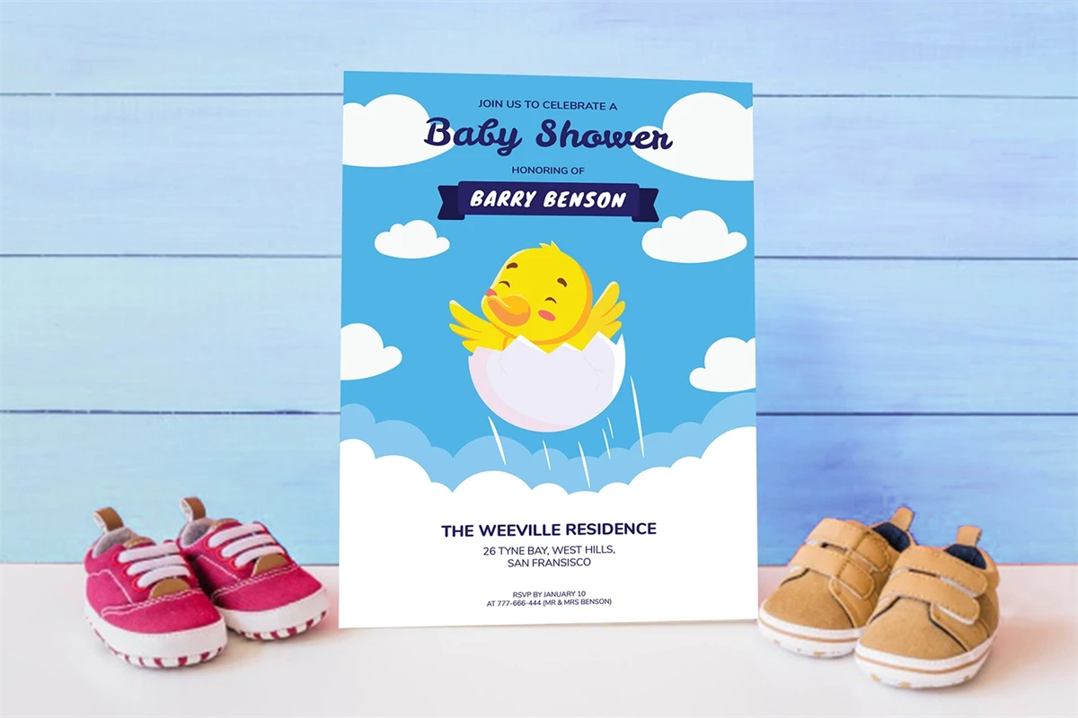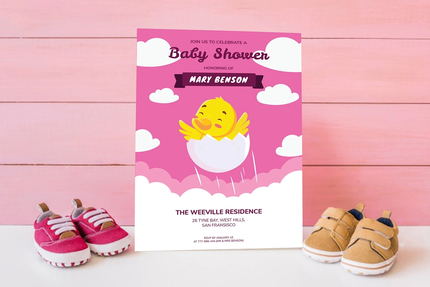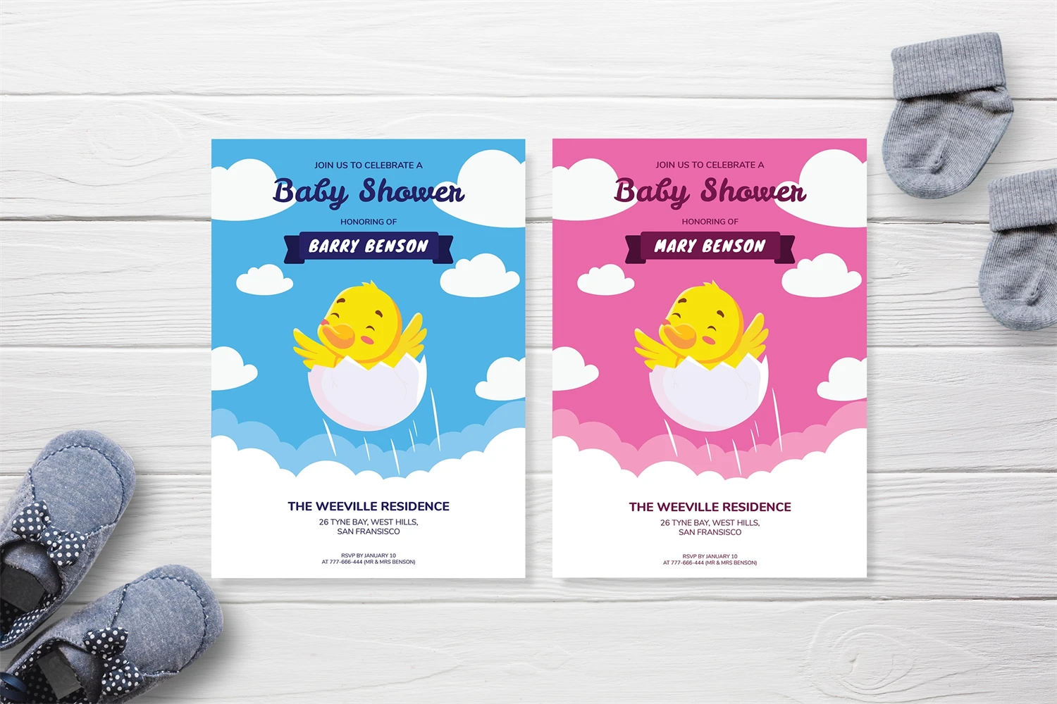 Flying Duck - Baby Shower Invitation, is an invitation card leaflet, poster design, etc. Simple and very elegant You can easily edit & adjust each design because each layer such as text, images and shapes are well organized and highlighted.