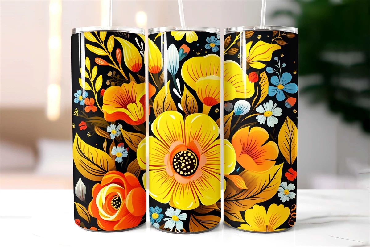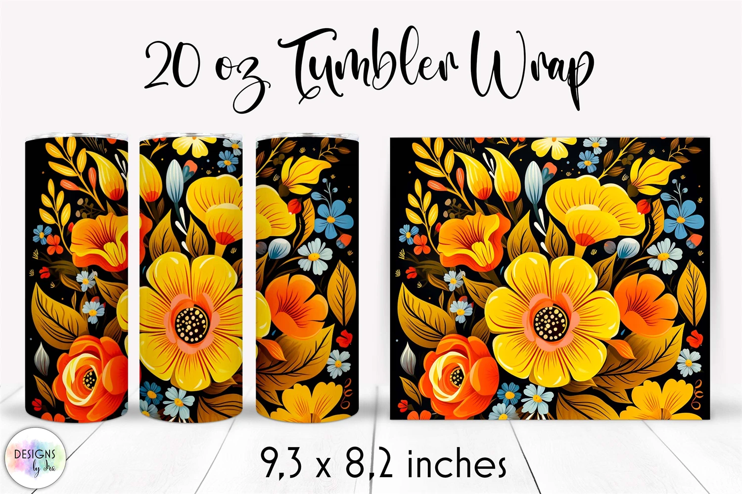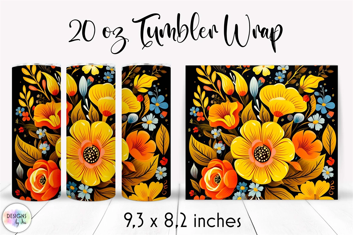 Folk Art Floral Tumbler Wrap, Folk Art Style Flowers PNG