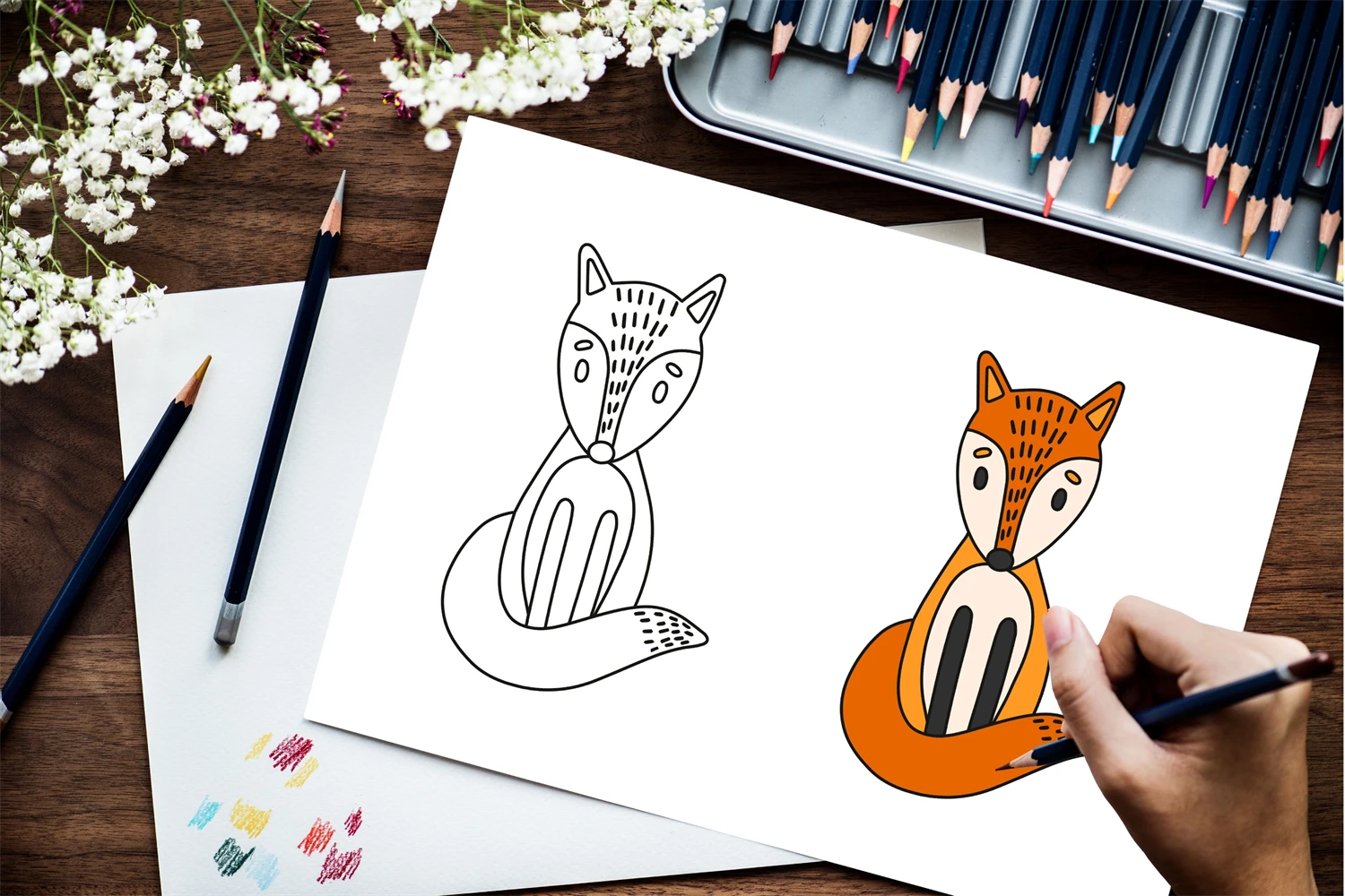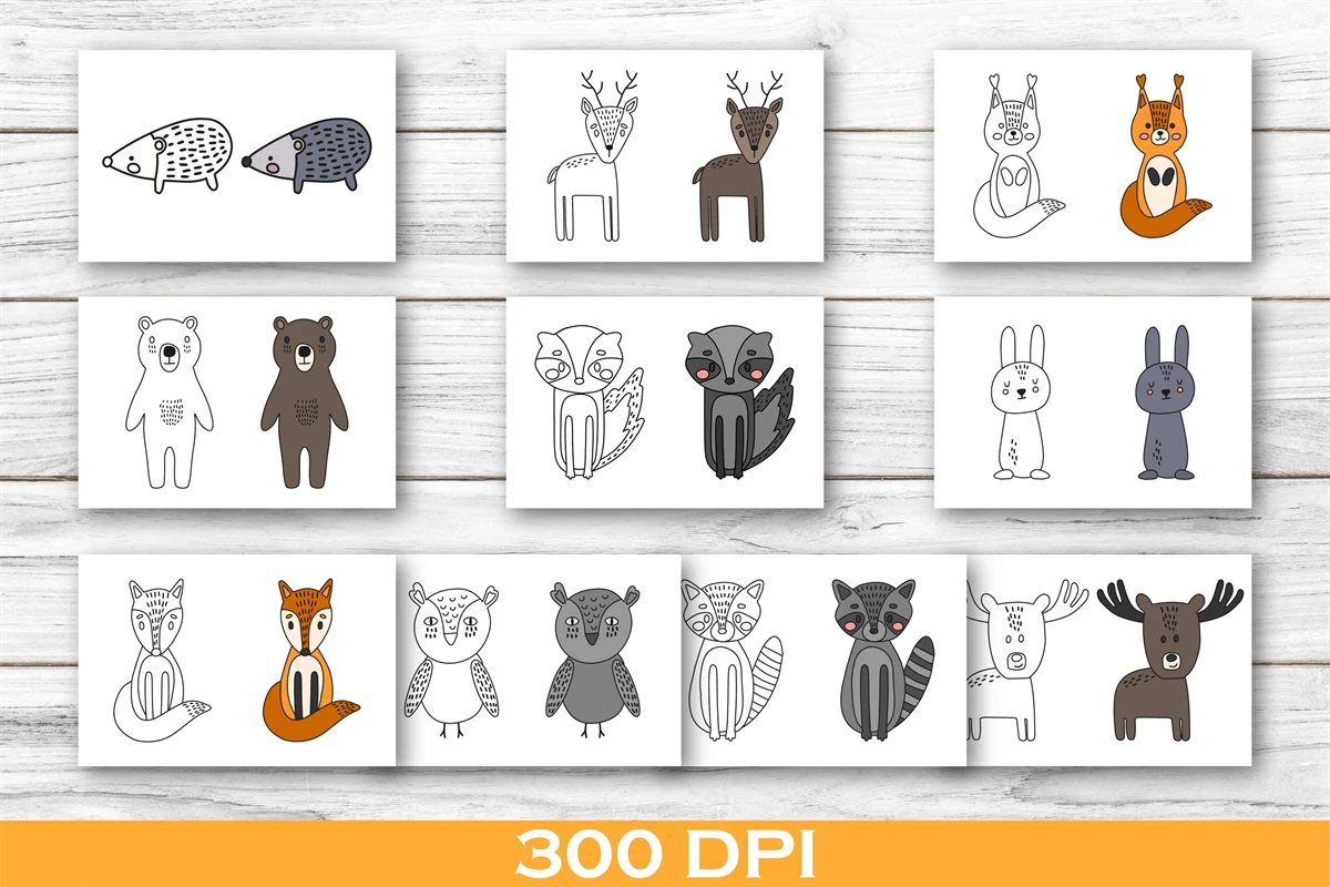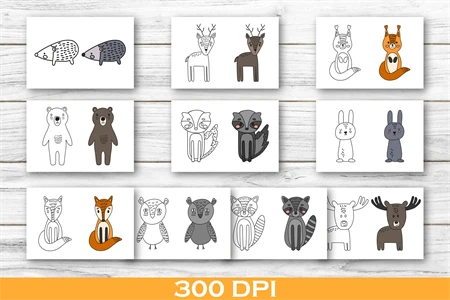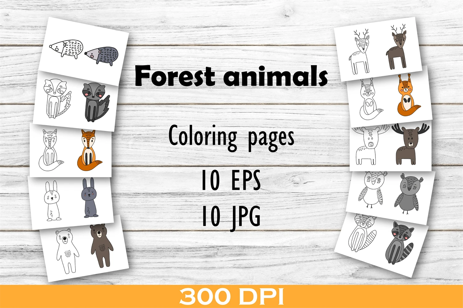 10 coloring pages for the youngest forest animal theme. Cartoon pictures of fox, bear, racoon and others