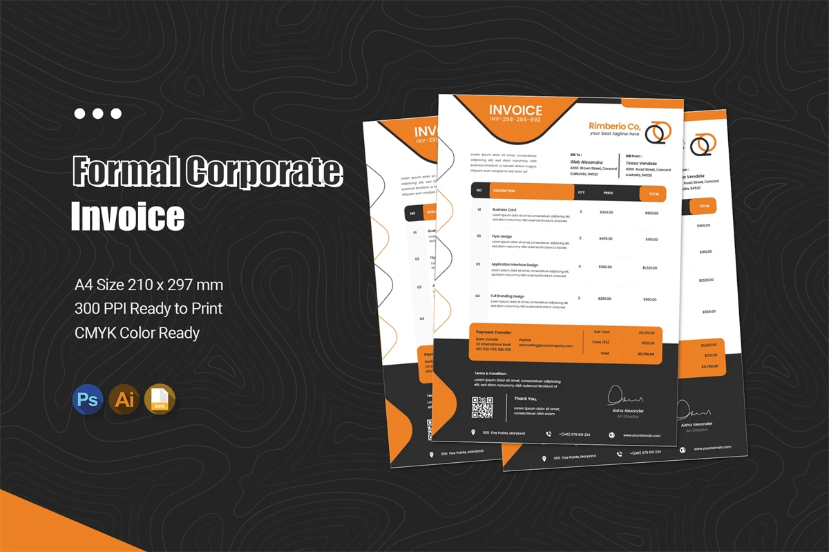 Use our invoices to make your bookkeeping easier and to impress your clients with an invoice display that has a modern, elegant design and strong typography. This invoice template is easy to use and customizable, making it perfect for any medium.