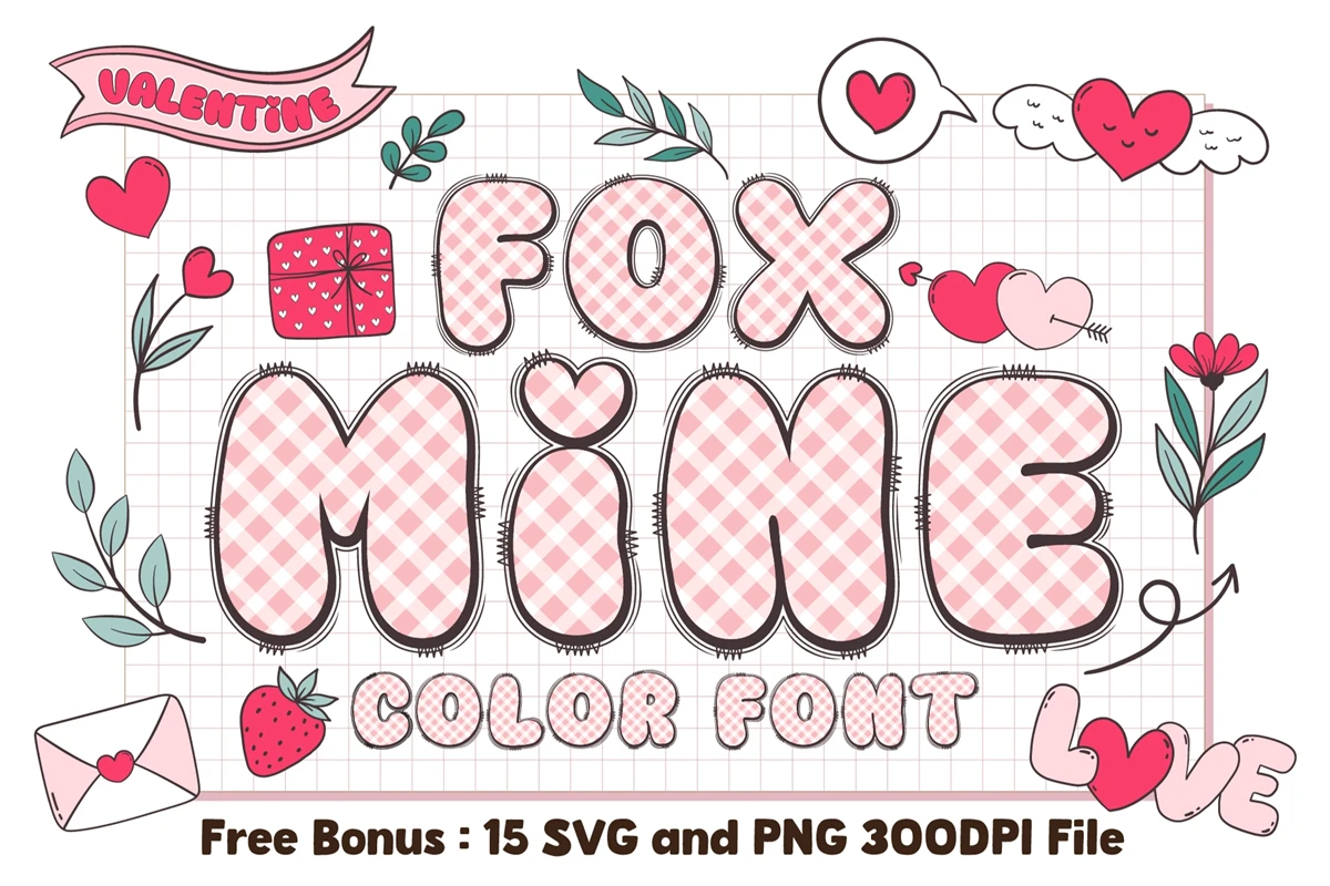 Fox Mine Its a decorative font and Color Font, a cute style, and fun. It is perfect for your Valentine's Day designs - or any design!. Fall in love with its authentic feel and use it to create gorgeous invitations, beautiful stationary art, eye-catching social media posts, and cute greeting cards. Add it now to your fonts library, and start creating spectacular designs!
