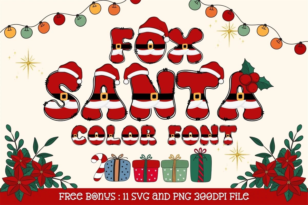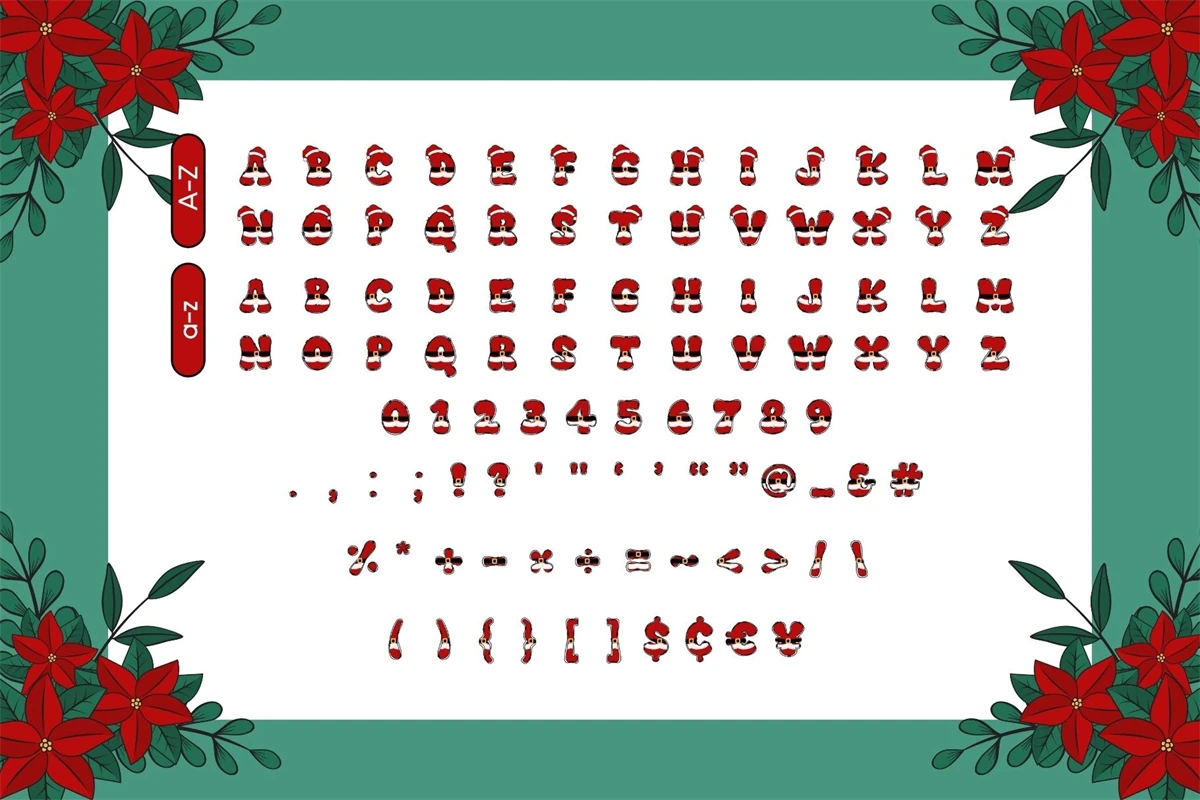 Elevate your holiday designs with the whimsical charm of our Fox Santa Font. This delightful font is specially crafted to infuse your projects with the joyful spirit of Christmas, featuring a jolly old Santa Claus complete with a festive Santa hat on top for every letter from A to Z. With its playful and decorative style, Fox Santa Font is the perfect addition to your holiday-themed creations, whether it's greeting cards, posters, banners, invitations, or any design that needs a touch of holiday cheer.