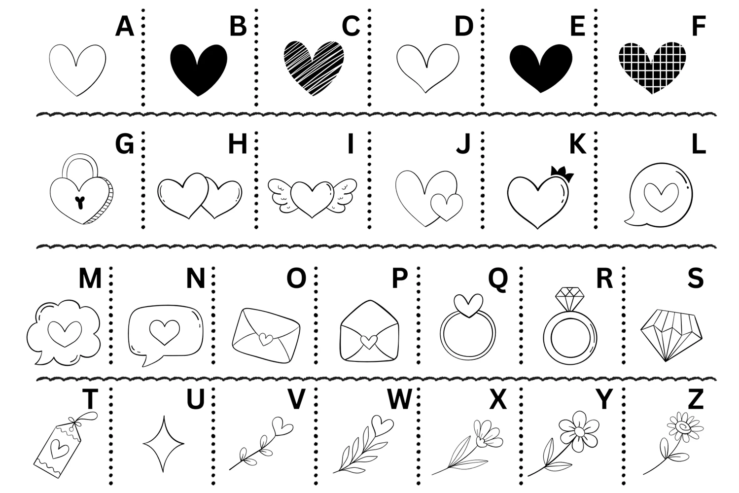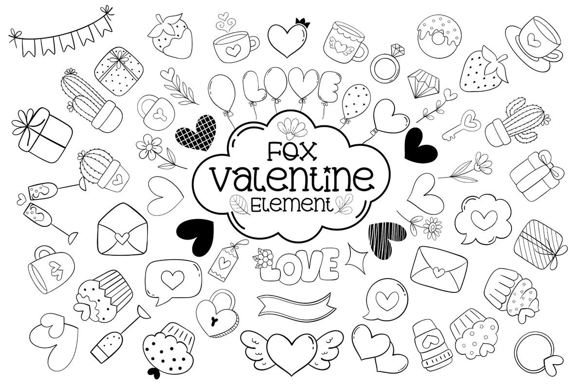 Fox Valentine Doodle is a cute dingbat font specially designed for the Valentine's season and party., Its versatility makes it great for a wide pool of craft projects, designs, planners, diaries, activity books, or anything that your heart desires. Add this beautiful doodle dingbat font to each of your creative ideas, and notice how it makes them stand out.