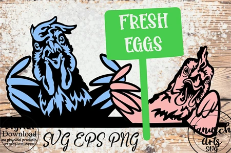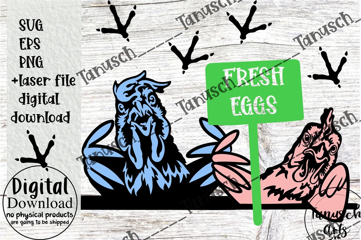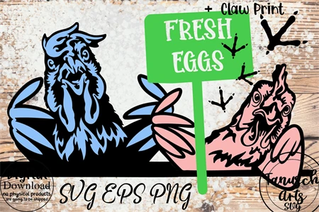 Hand painted hilarious Speaking Rooster and Chicken SVG - design plus chicken claw print :) "FRESH EGGS"
