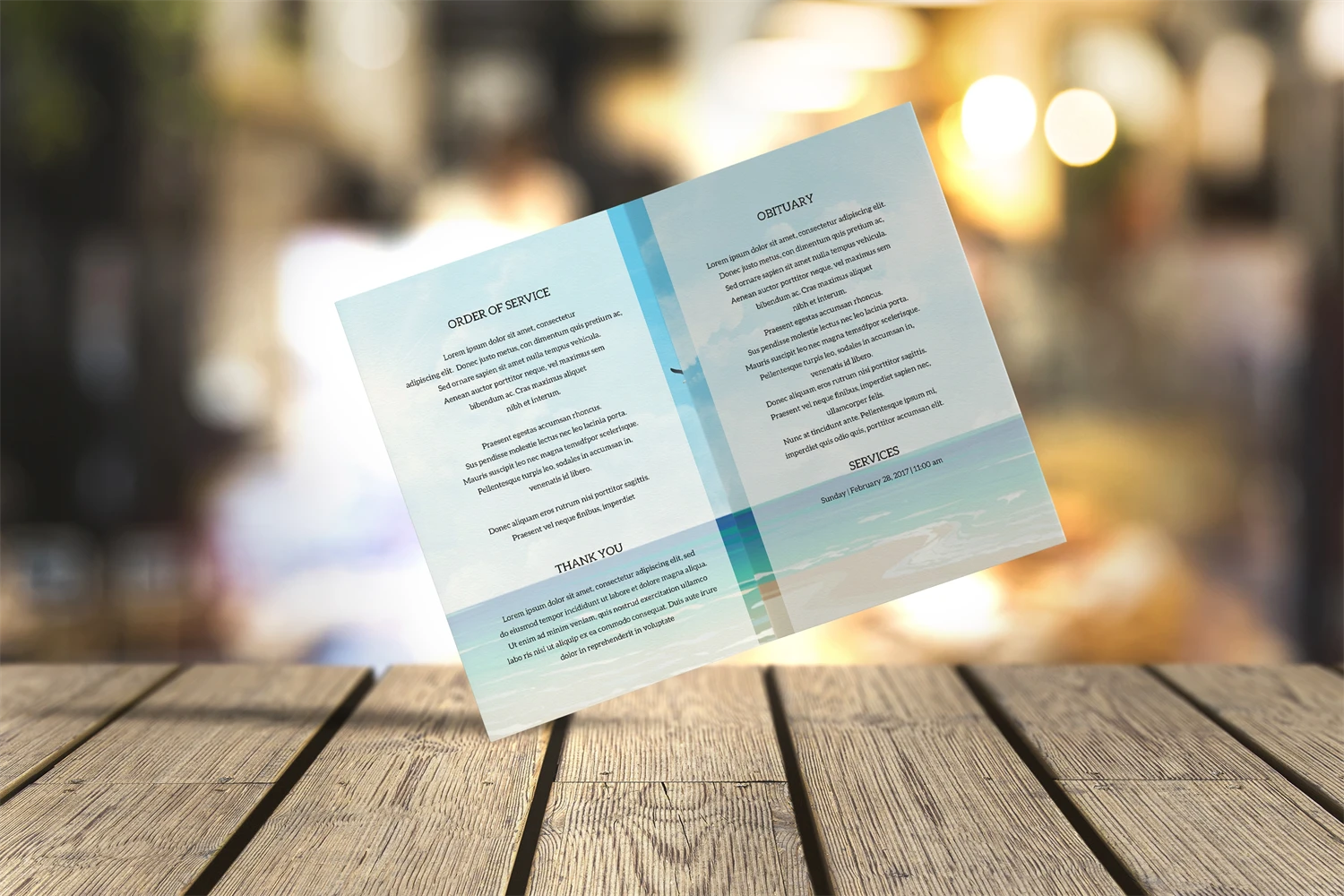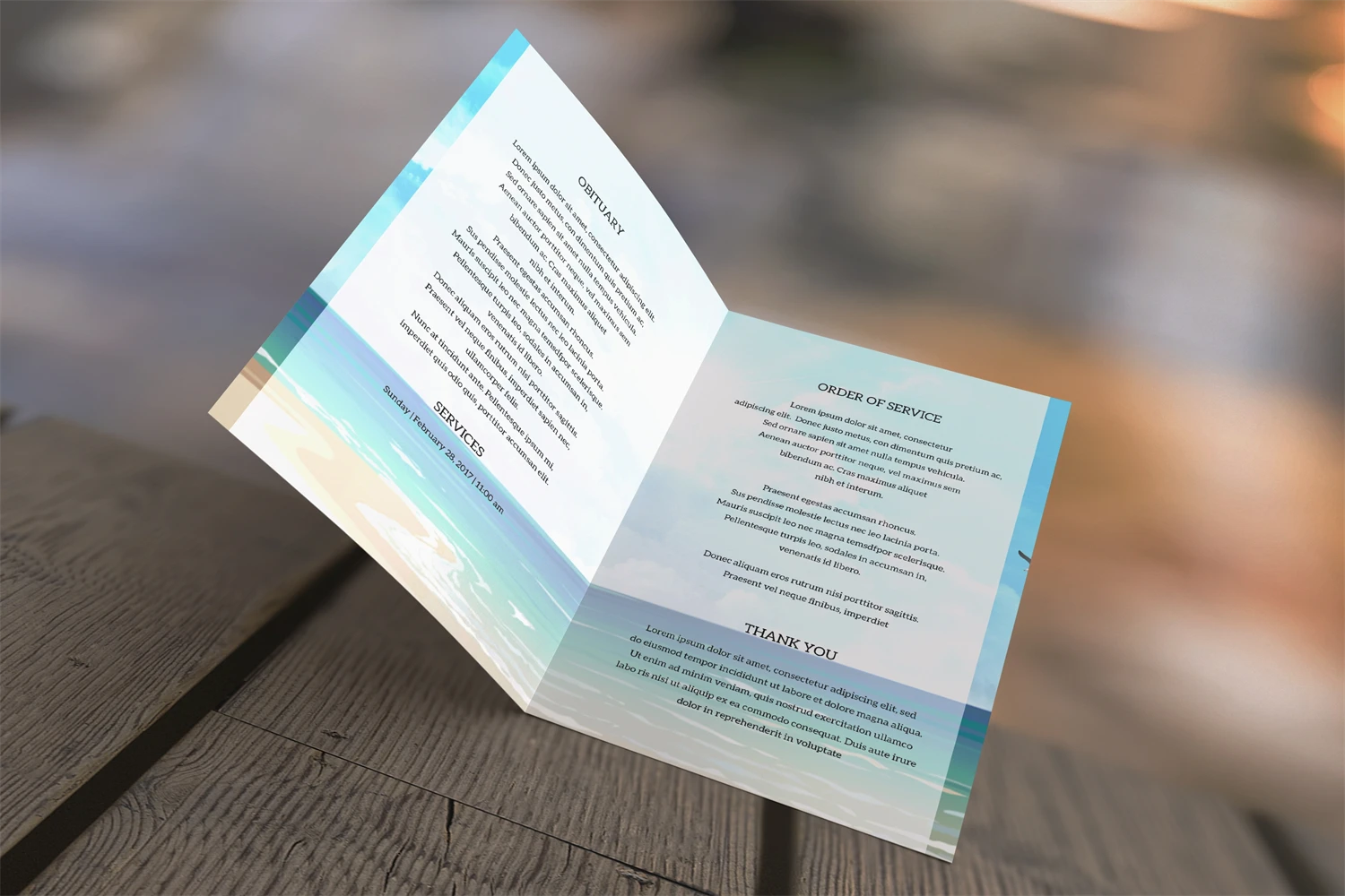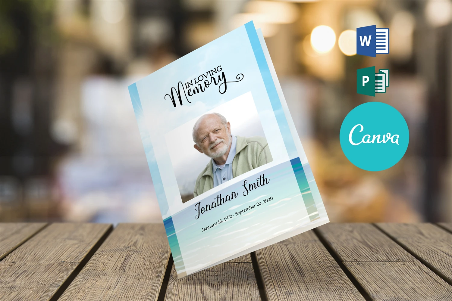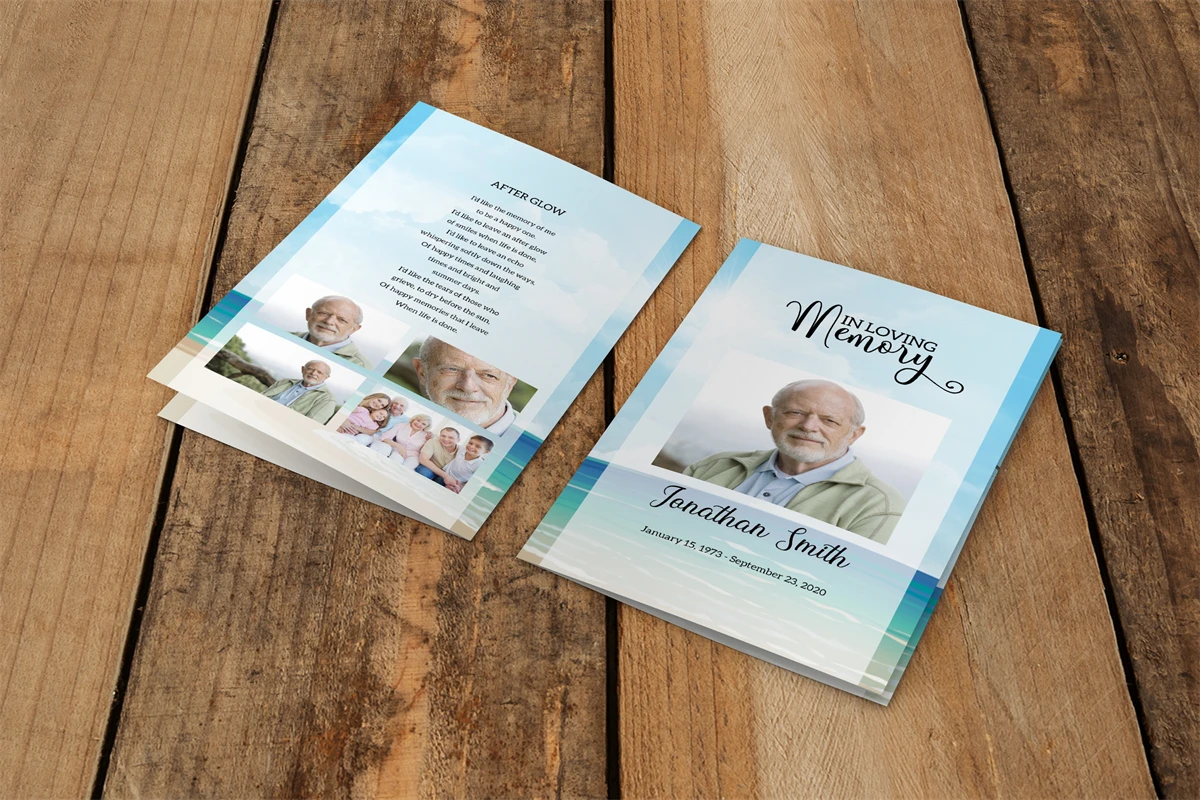 Funeral program template 4 page for men with beautiful blue sea beach. This template is a great way to honor your loved one.
