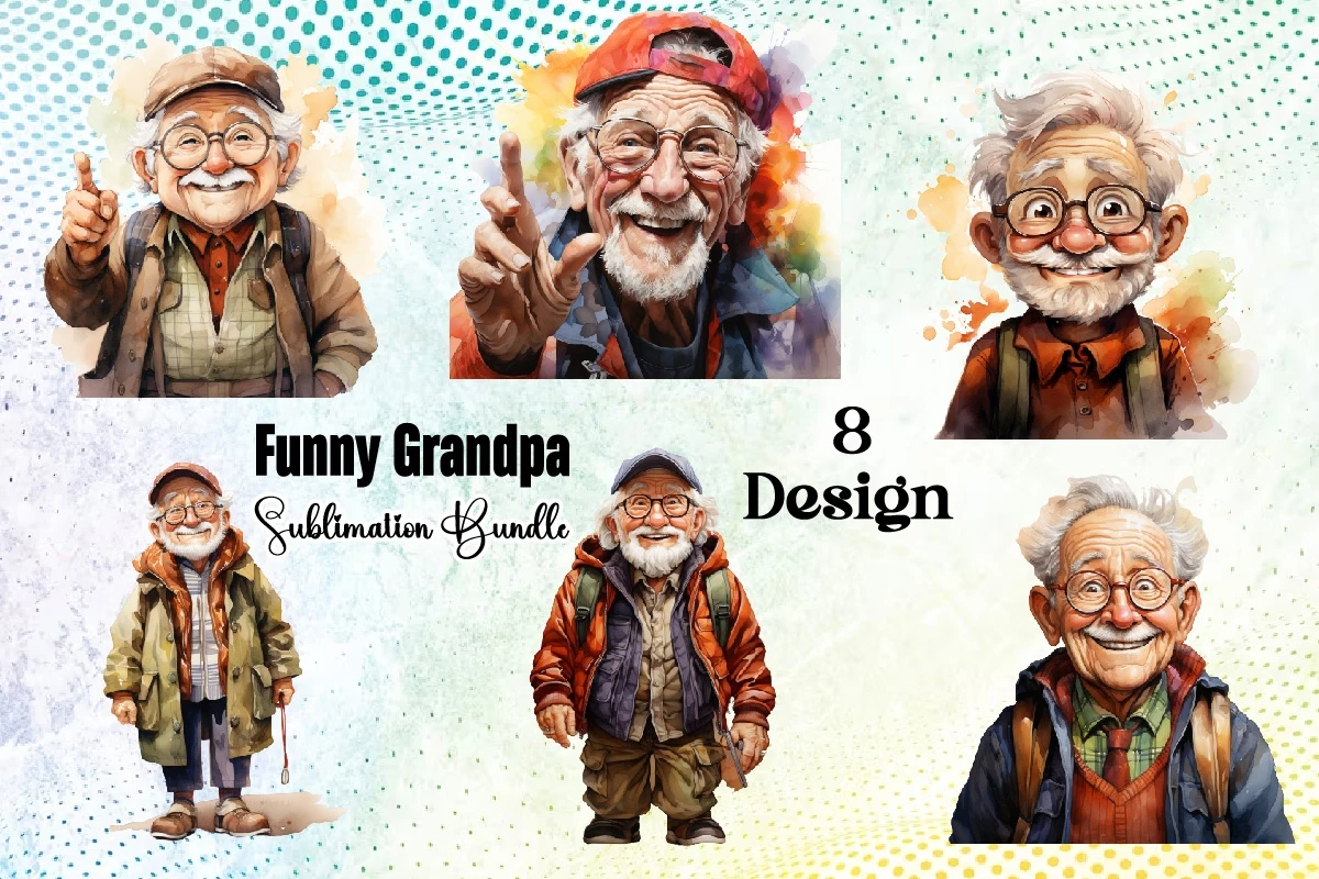 Watercolor Funny Grandpa Clipart PNG Bundle