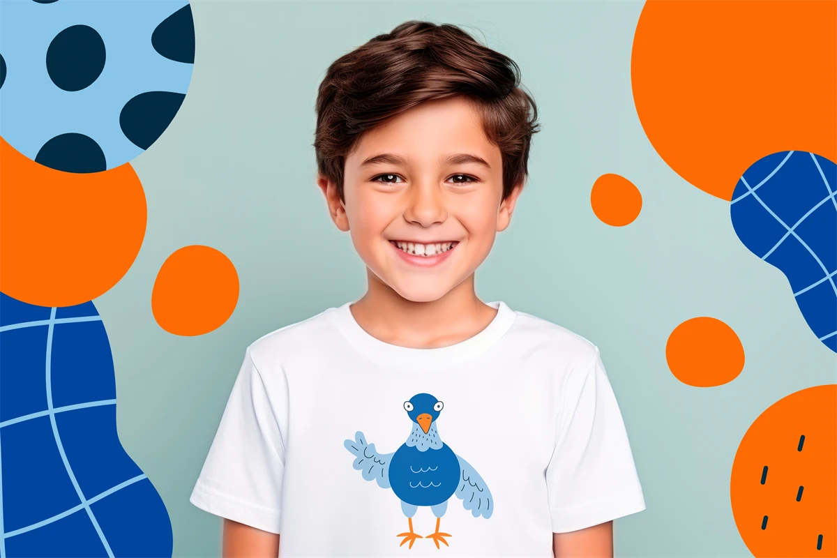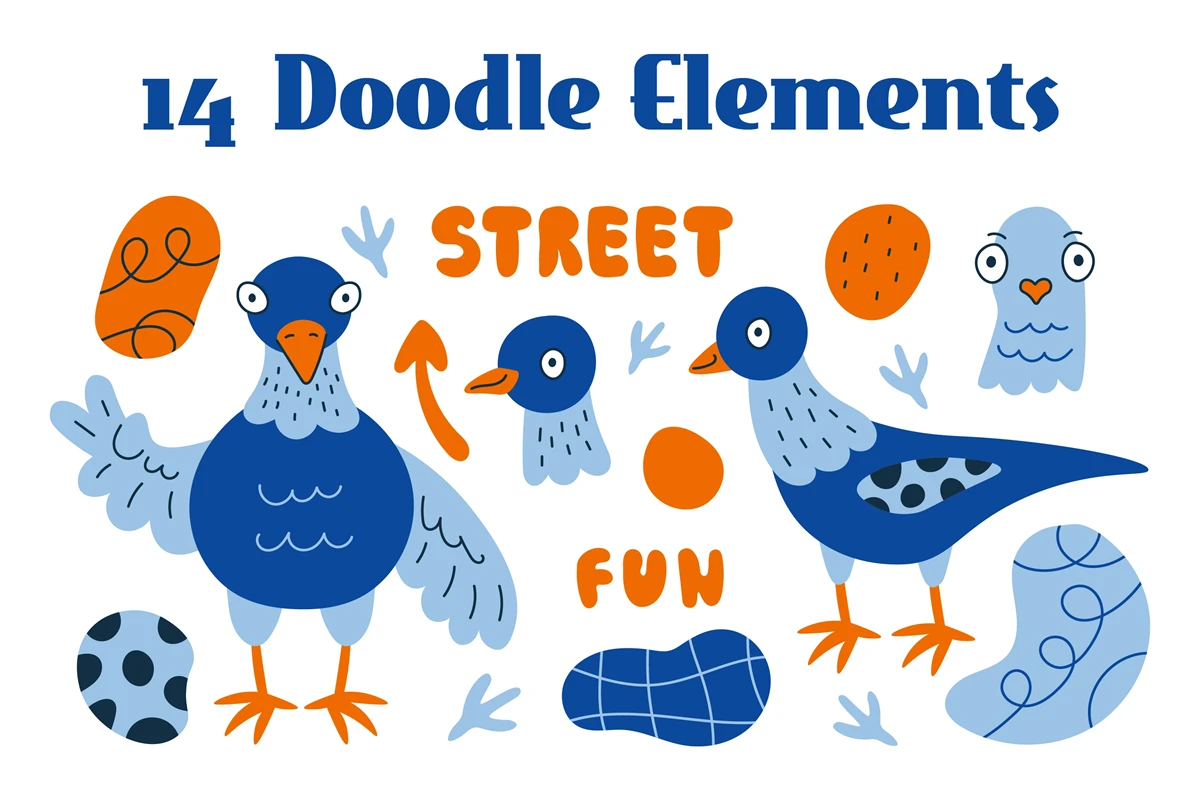 Modern colorful abstract organic shapes and funny quirky pigeon. Hand-drawn cartoon bird and textured geometric forms and elements. Comic dove vector illustration for kids, social media, sublimation, stickers, print, etc.