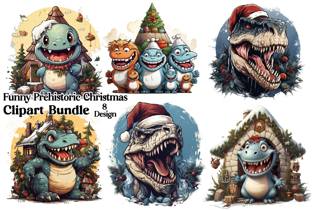 Watercolor Funny Prehistoric Christmas Clipart PNG Bundle