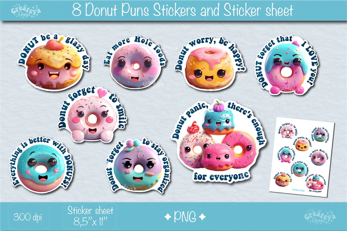These colorful Inspirational Kawaii Donut pun stickers are great for print and cut! Each Motivational sticker shows an adorable donut and a funny sarcastic saying to go with it. You can use them for scrapbooking, clipart, planner stickers, Invitations, Greeting Cards, Flyers, tags, labels, craft items, T-shirts, notebook covers, journals, and more, perfect for any day!