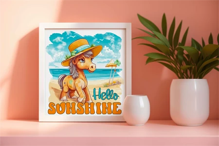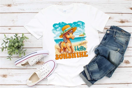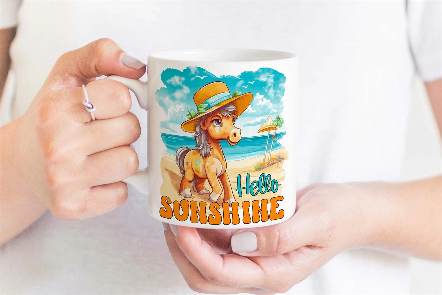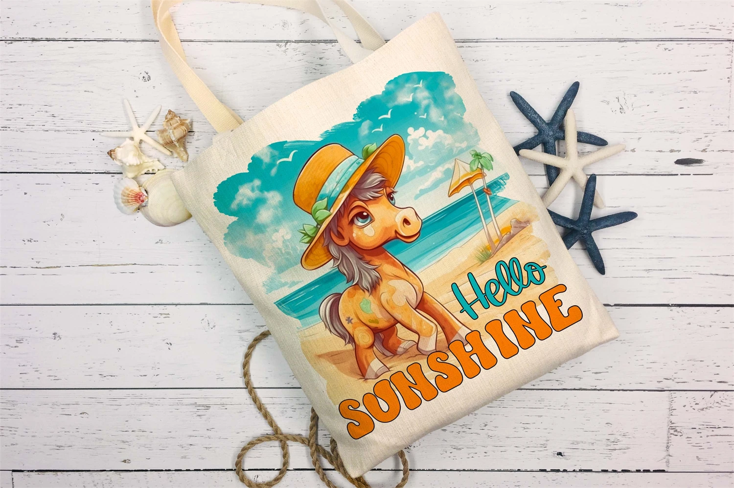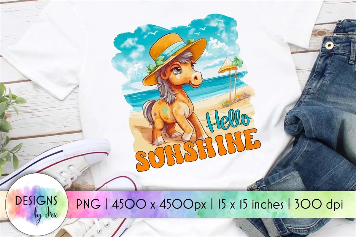 "Hello Sunshine" - funny summer sublimation with cute horse on the beach .