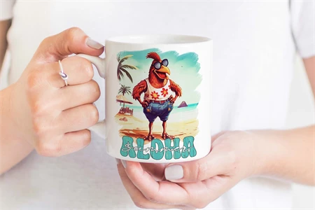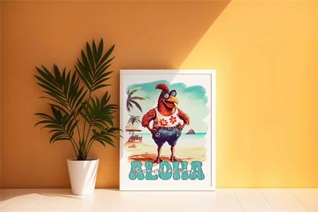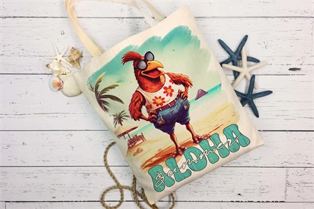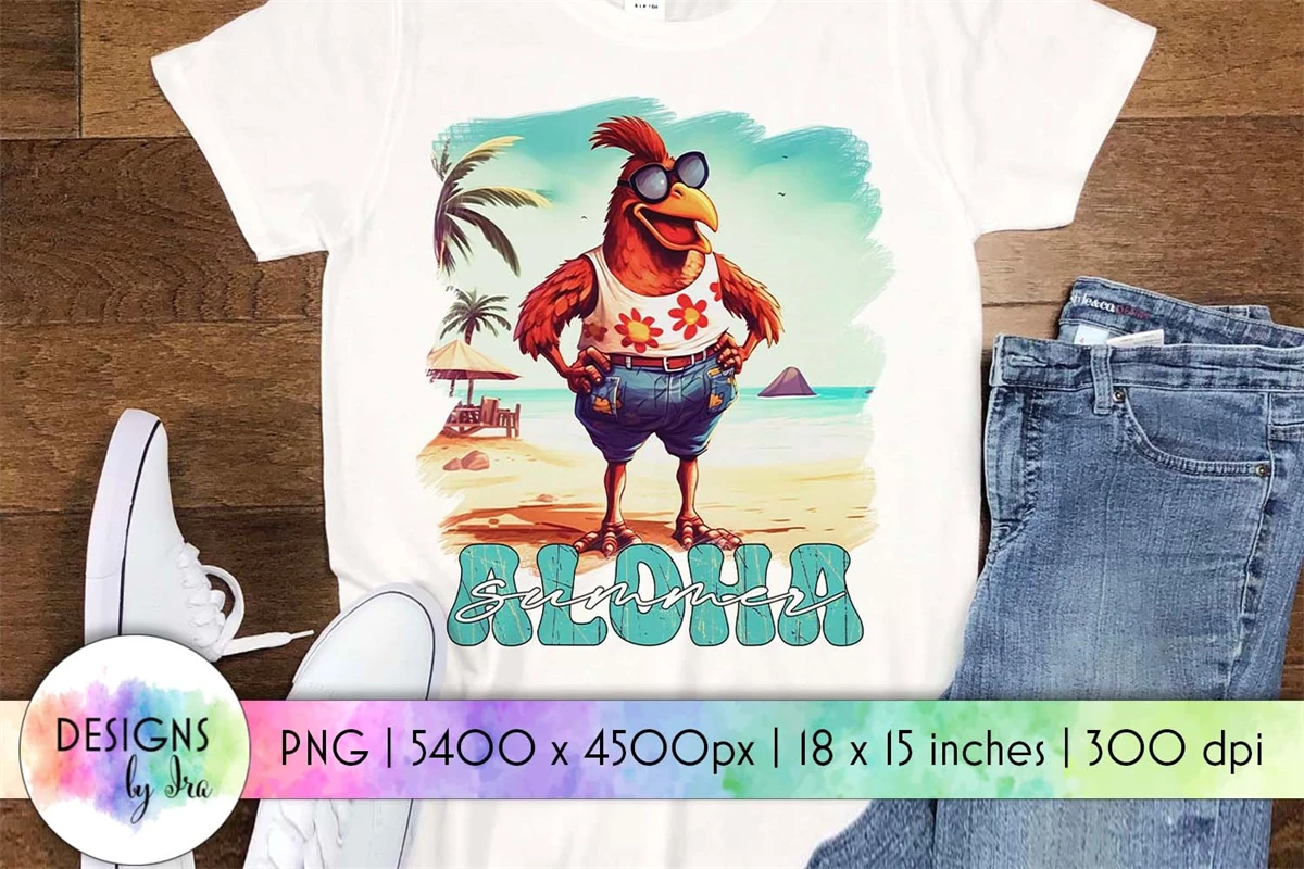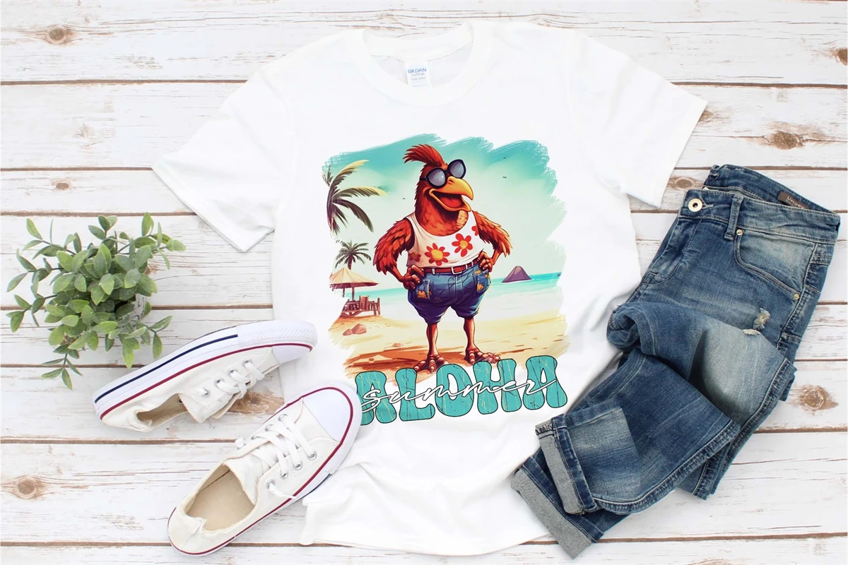 "Aloha summer" - funny summer sublimation with rooster on the tropical beach.