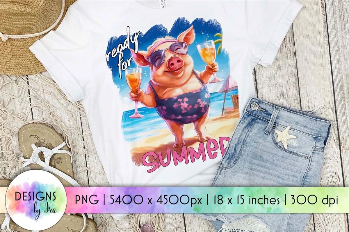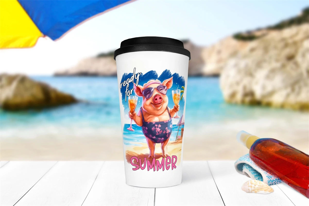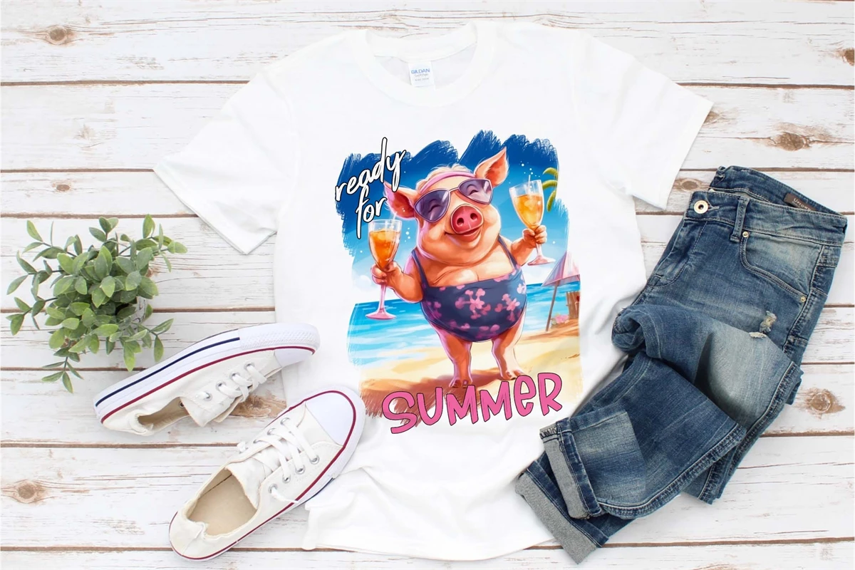 "Ready for summer" - funny summer sublimation with piggy on the beach drinking cocktail.