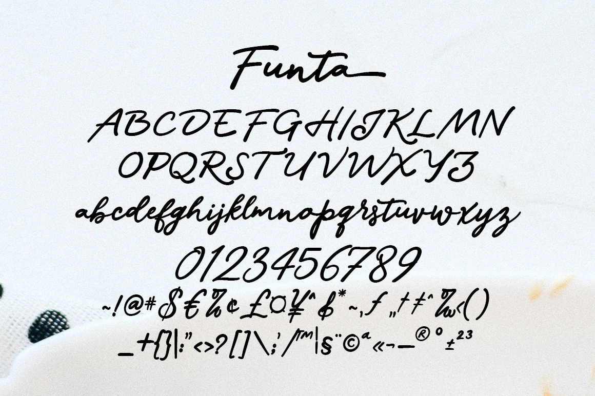 Funta Script is a typeface or font design that can be used to style text. It is characterized by tails and is slightly cursive, often giving the appearance of playful or relaxed text. Funta Script is widely used for design projects such as invitations, greeting cards, posters, headers or just used to express words over the background.