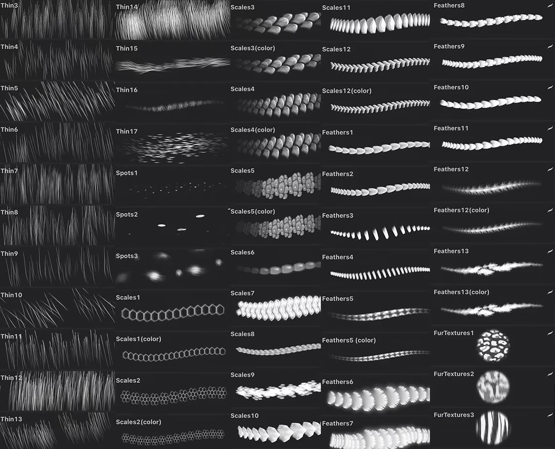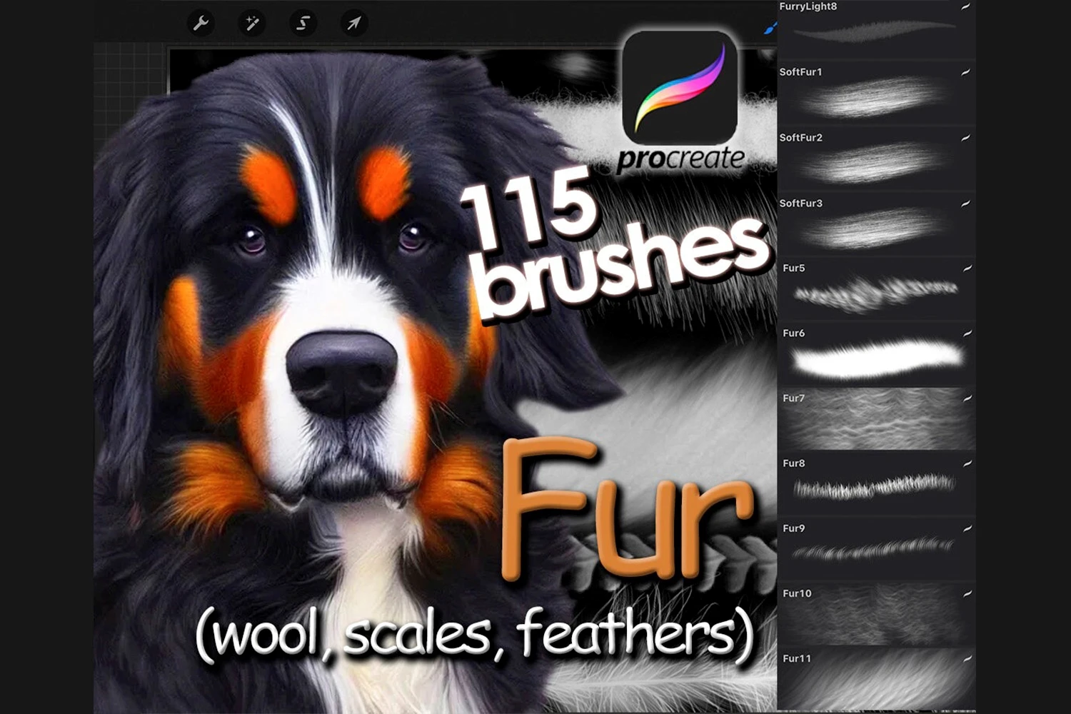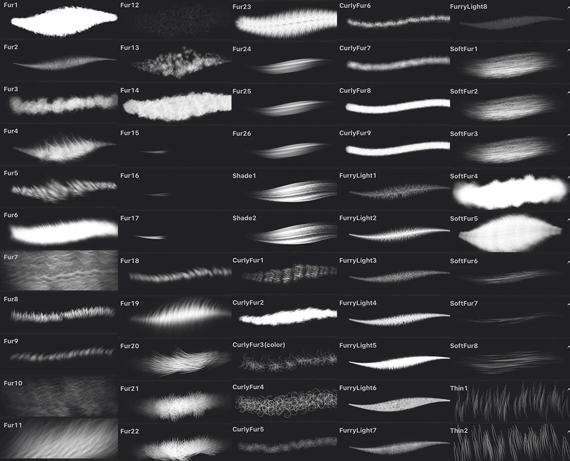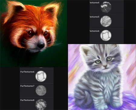 excellent set of brushes for painting hair animals, fur, Feathers, Scales, wool in Procreate