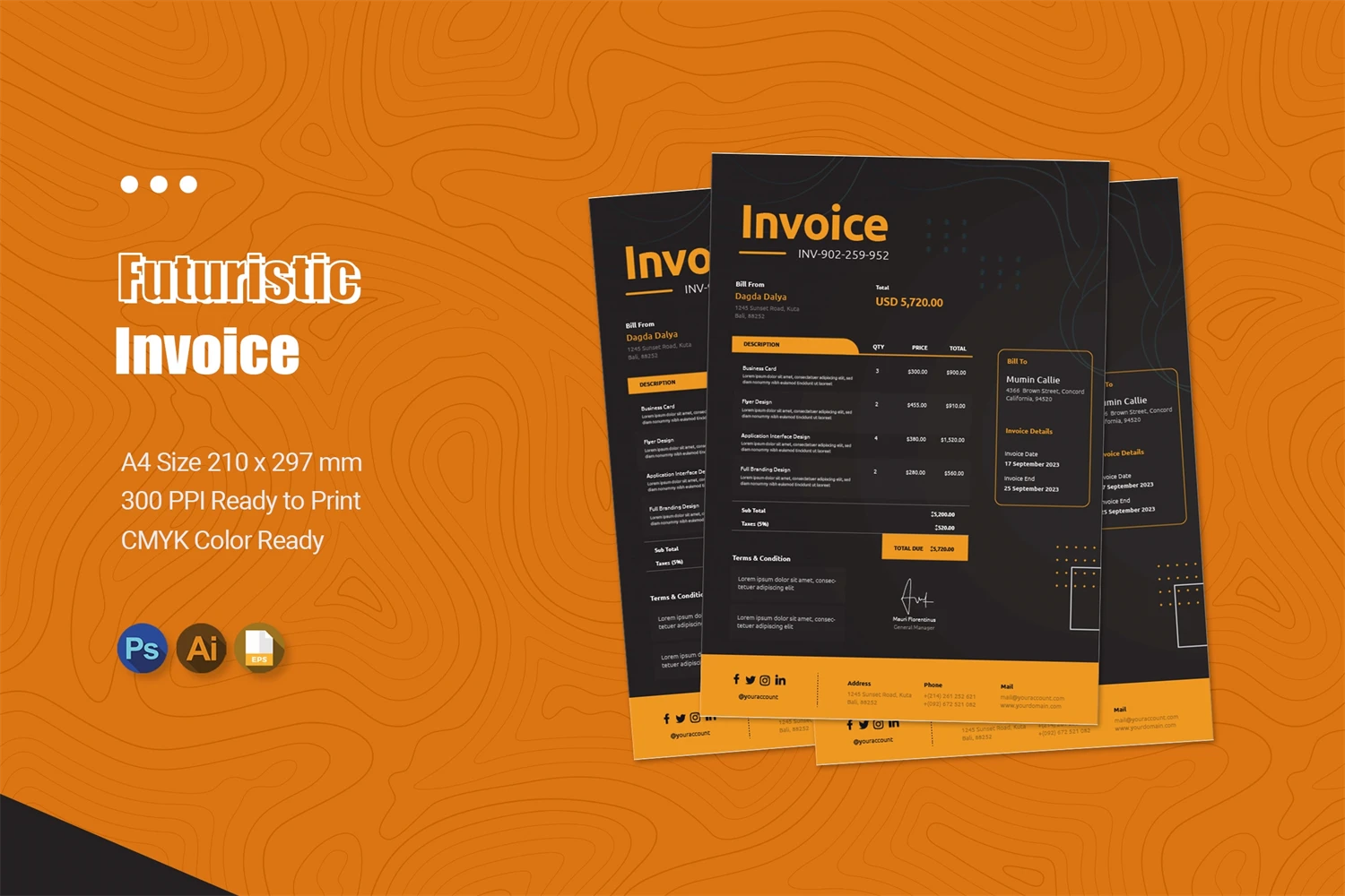 Use our invoices to make your bookkeeping easier and to impress your clients with an invoice display that has a modern, elegant design and strong typography. This invoice template is easy to use and customizable, making it perfect for any medium.