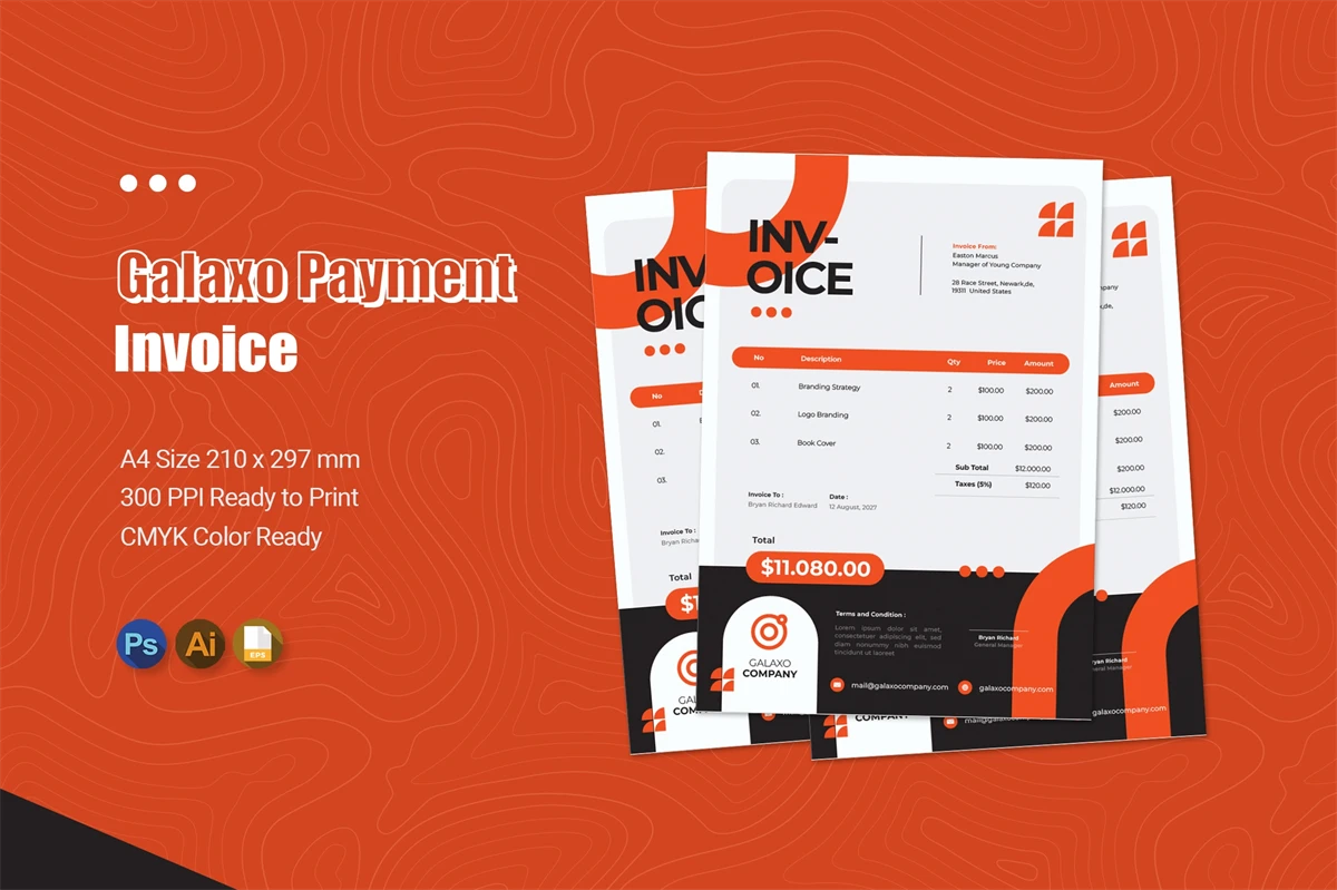 Use our invoices to make your bookkeeping easier and to impress your clients with an invoice display that has a modern, elegant design and strong typography. This invoice template is easy to use and customizable, making it perfect for any medium.