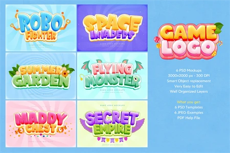 Get 6 Photoshop templates with game logos text effects. Cartoon style, vivid, tasty, candy letters are the best for funny mobile games.
