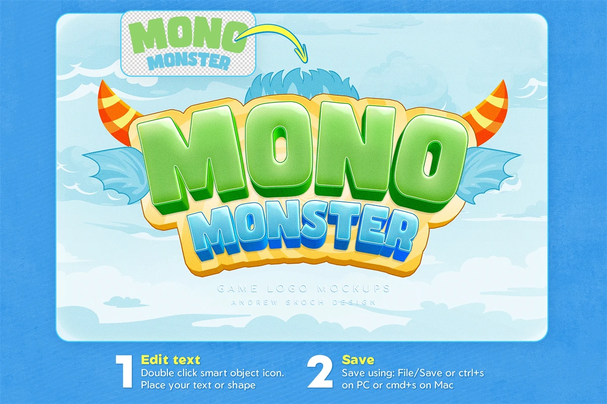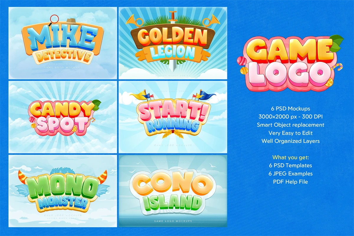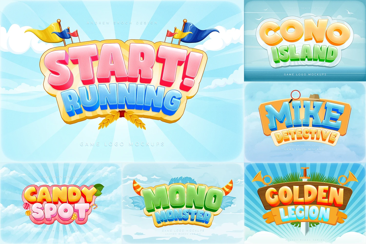 Get 6 Photoshop templates with game logos text effects. Cartoon style, vivid, tasty, candy letters are the best for funny mobile games. Colorful lettering for your game logos. Good for mobile gaming ui. Great way to present your mobile game in apps store. All texts are editable. Just edit text and all effects will be applied automatically.