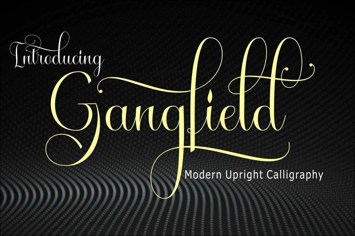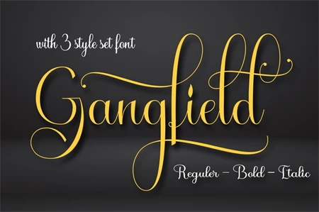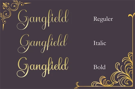 Gangfield's bright and cheerful energy shines through either in the form of short blocks of text, or enhanced on display sizes with over 1,100 wildcards and swashes that vary in size and complexity. Gangfield includes 134 alternates with various variations plus several variants of ligatures which make it ideal for special dates such as weddings and parties.