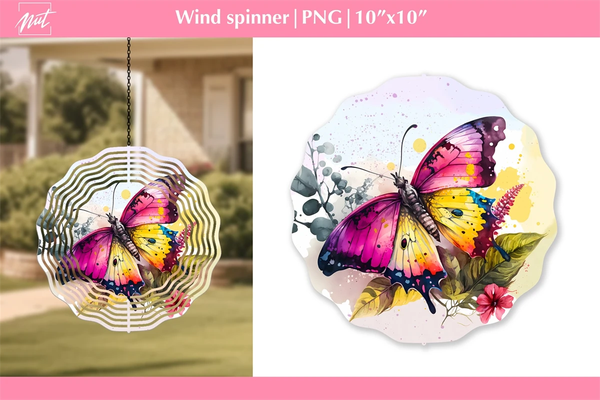 Vibrant pink yellow butterfly and flowers wind spinner sublimation design for decoration of your garden.