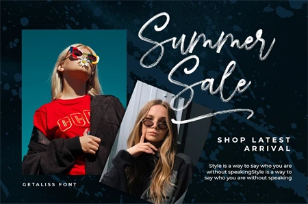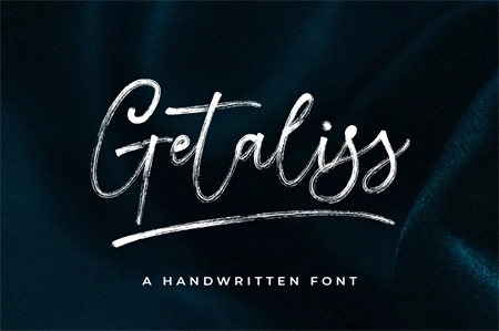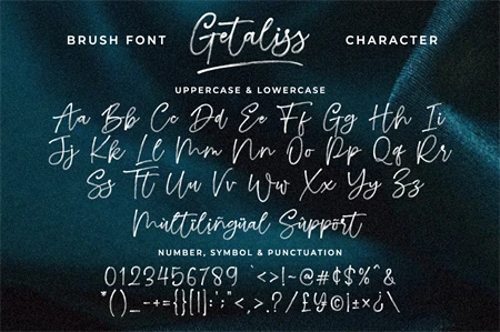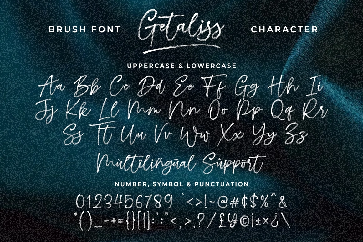 Getaliss is a casual script font suitable for a variety of projects, such as branding, invitations, merchandise, websites, advertisements, magazines and more. You'll get a full set of lowercase and uppercase letters, numbers and punctuation, multilingual symbols, ligatures, and extra strokes.