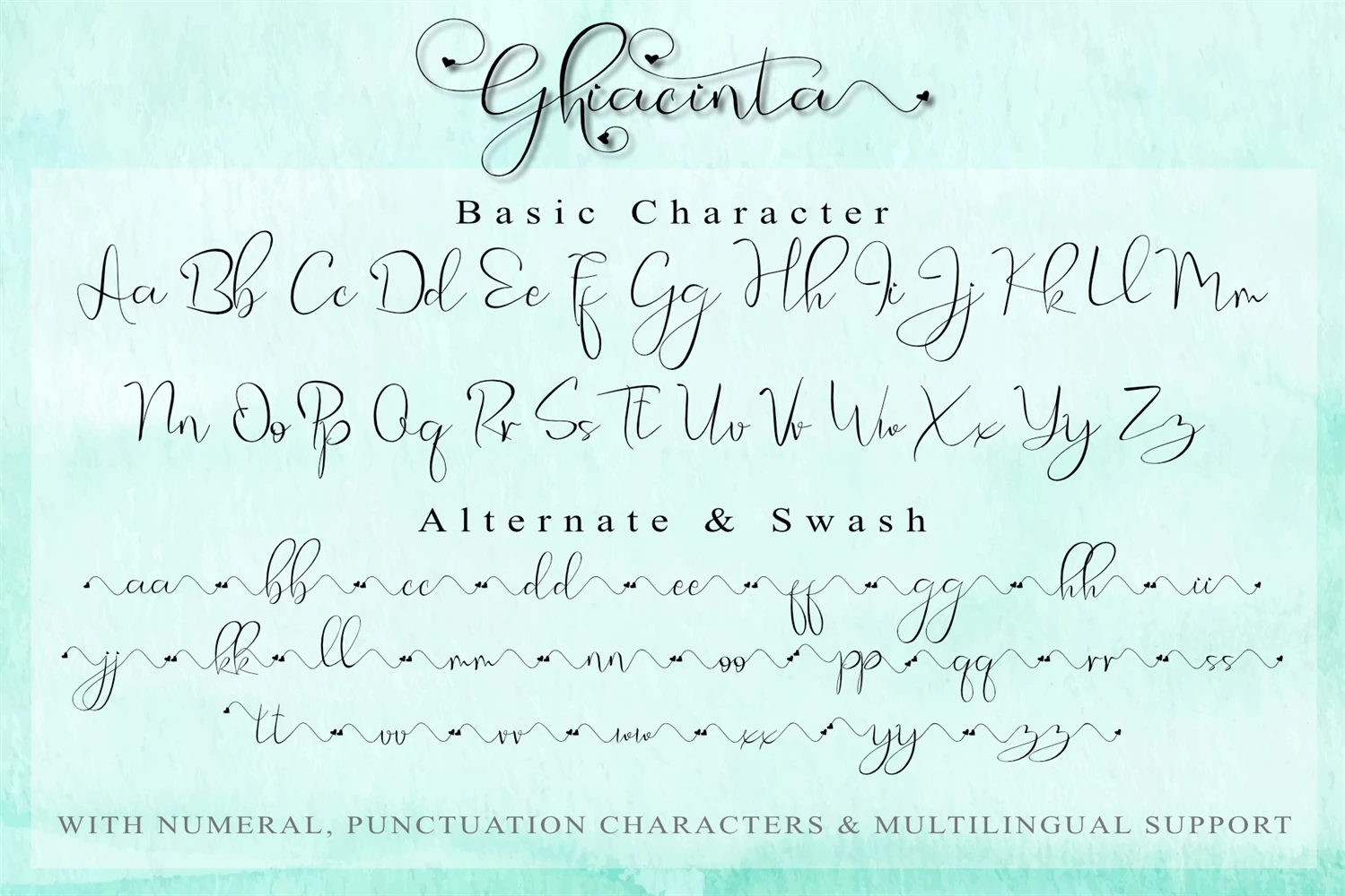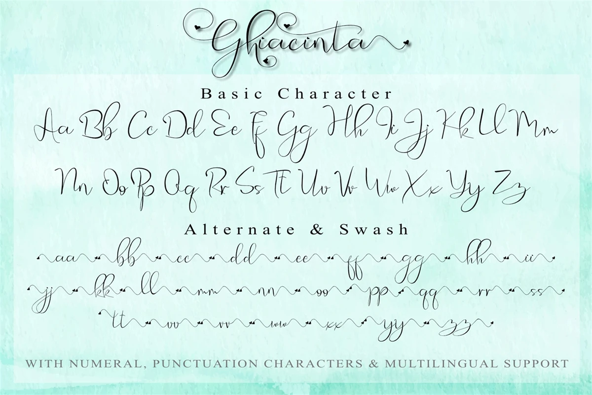 Ghiacinta is a flowing and timeless handwritten font. It is PUA encoded, which means that you can access all of the glyphs and swashes with ease! It features a varying baseline, smooth lines, gorgeous glyphs and stunning alternates. Fall in love with its incredibly versatile style and use it to create spectacular designs!