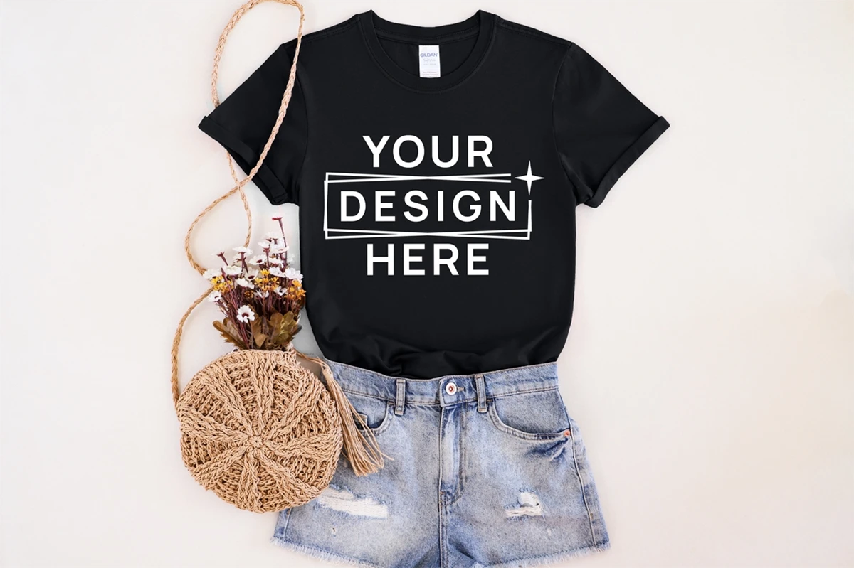 Gildan 64000 Black Mockup, Unisex T-Shirt, Flat Lay, Styled