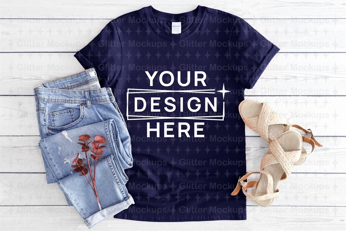 Gildan 64000 Navy Mockup, Women T-Shirt, Flat Lay, Png