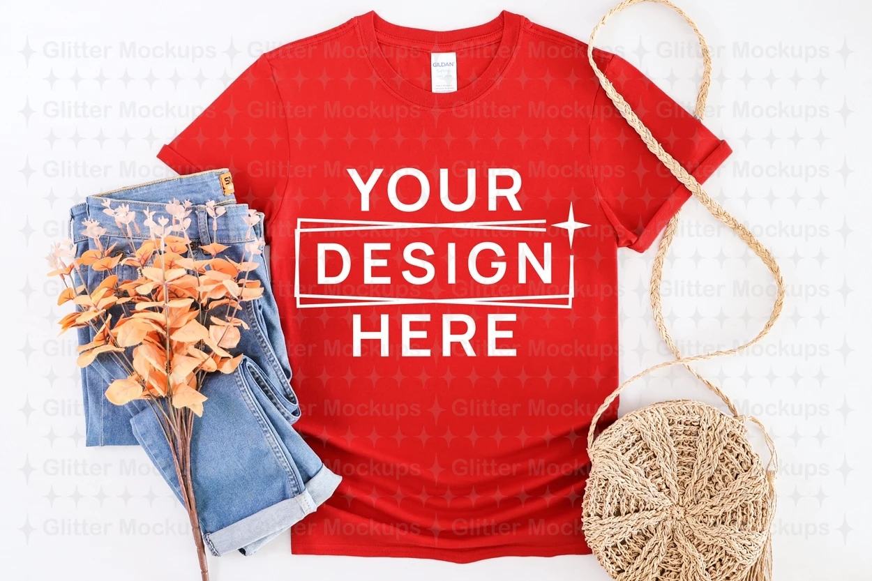 Gildan 64000 Red Mockup, Unisex Tee, Softsyle, Flat Lay, Png