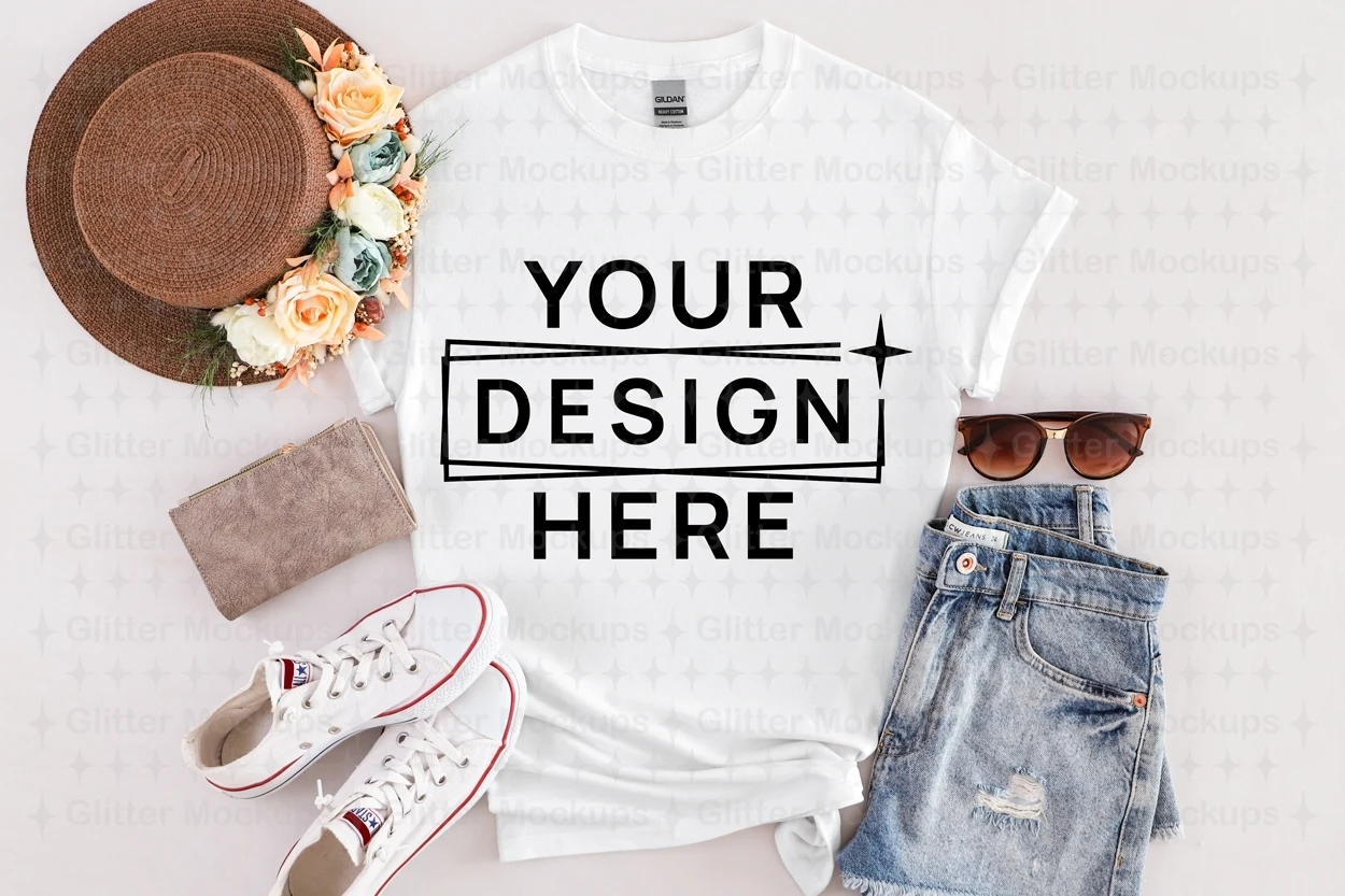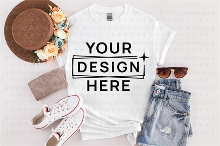 Gildan 64000 White Mockup, Women T-Shirt Mockup, Flat Lay