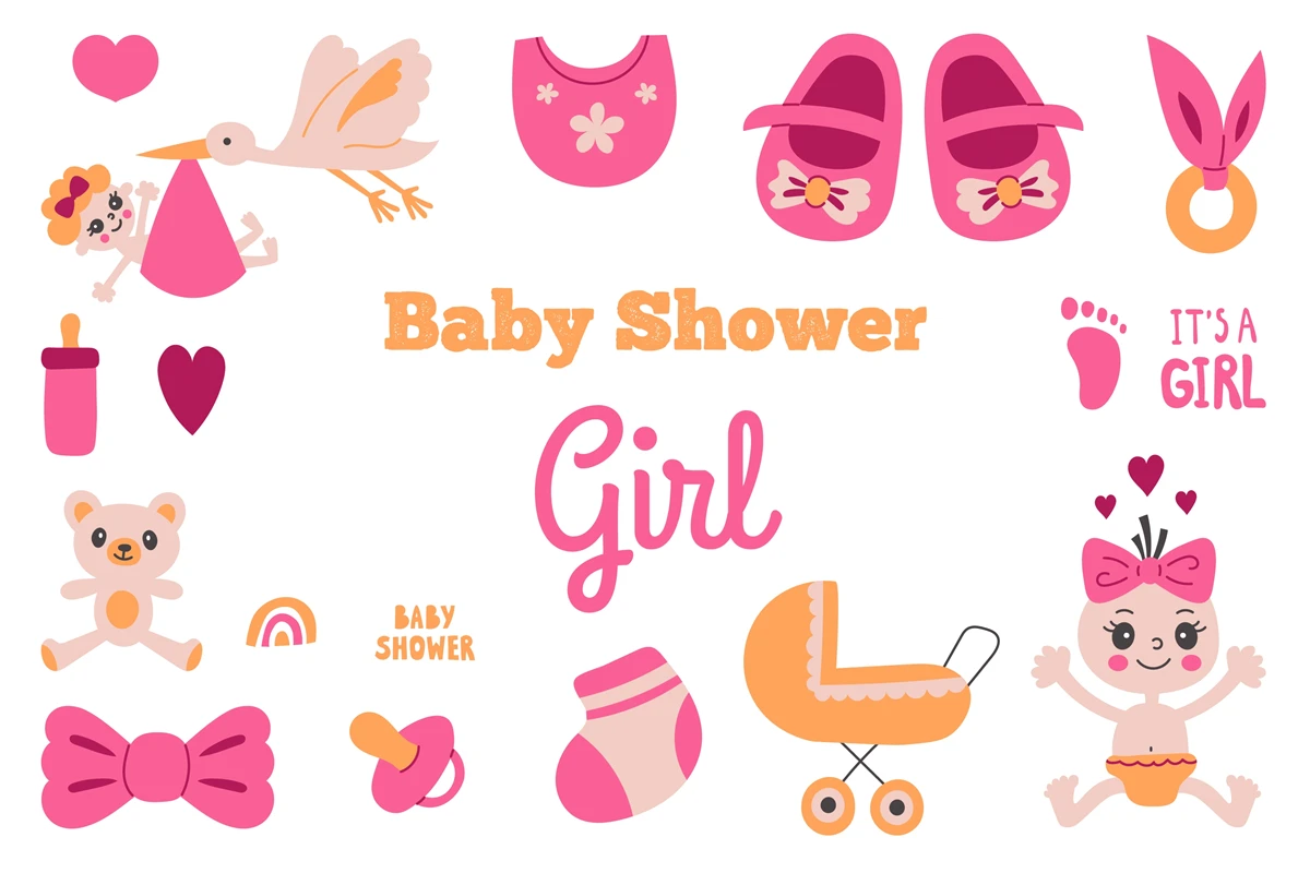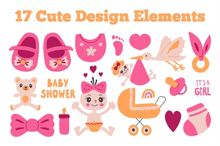Cute hand-drawn clipart for Girl Baby Shower design. Pastel colored pink elements in trendy minimal style are perfect for greeting card, invitation, poster, banner, sublimation, nursery, print, etc. Vector illustration.