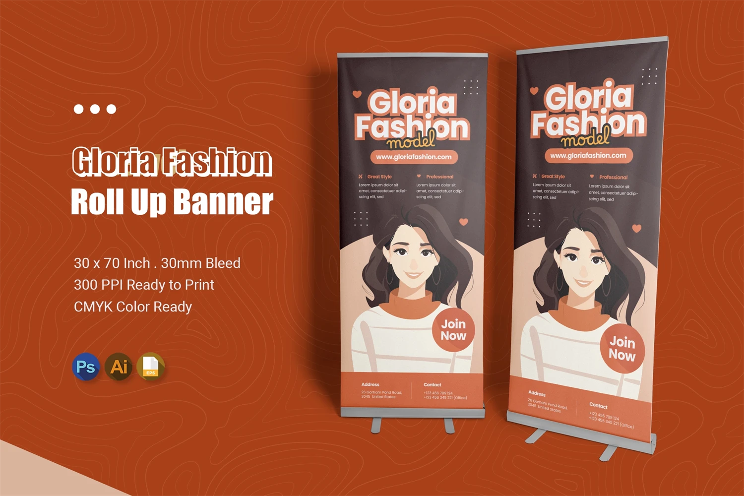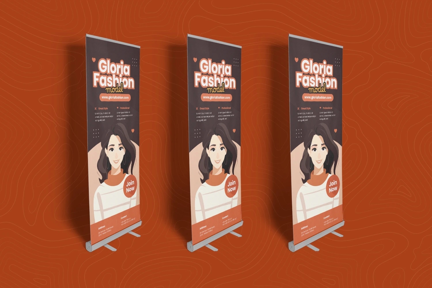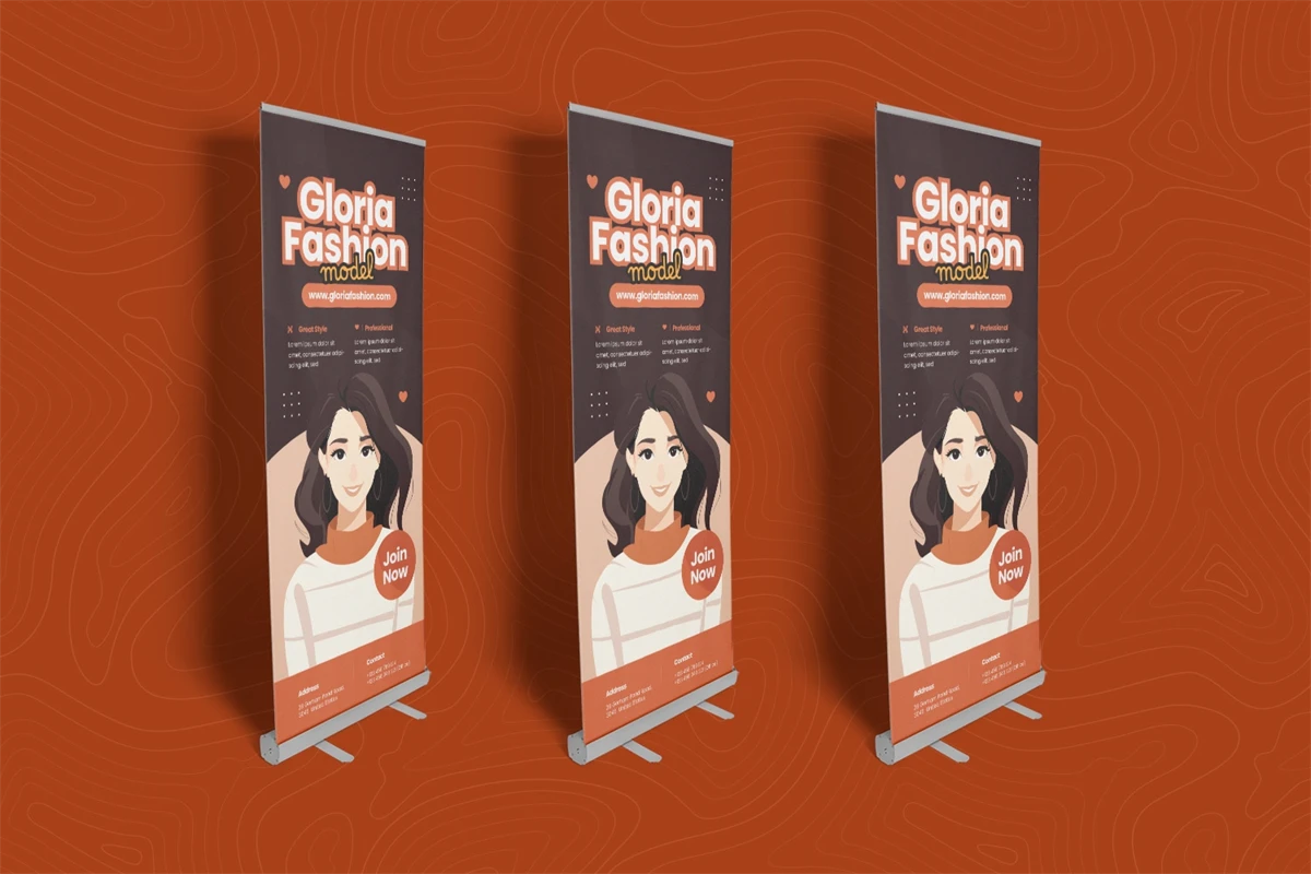 Our roll-up banner template tells your brand's story at a glance. This design stands out and can be used to showcase pictures and content effectively.