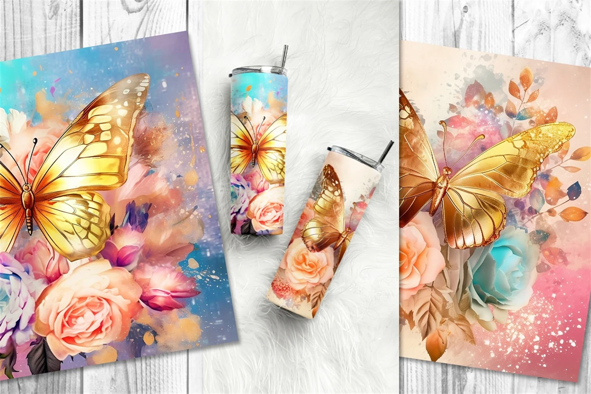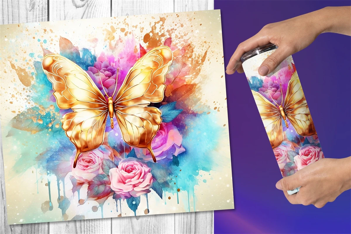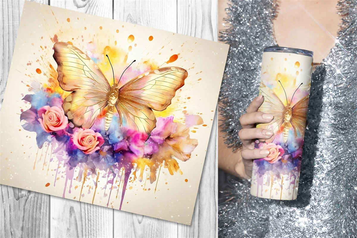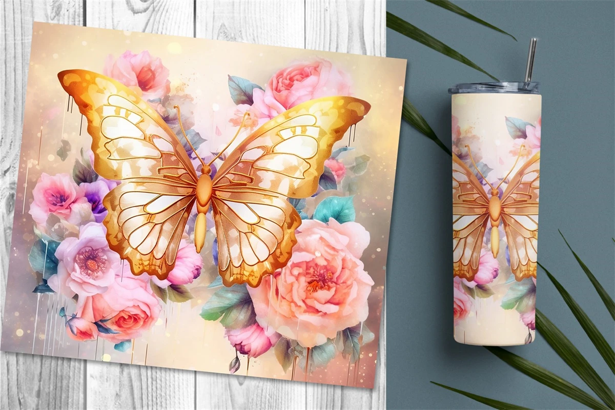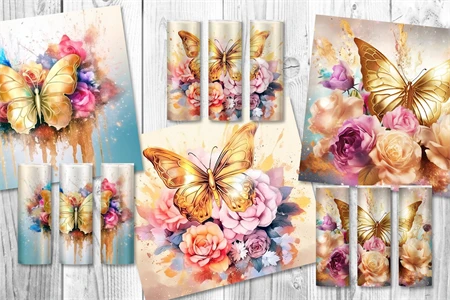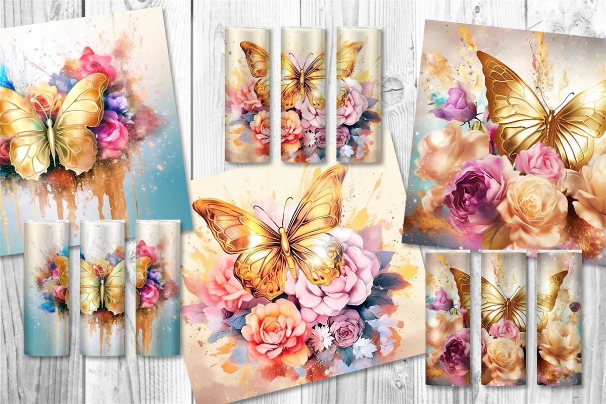 10 designs of gorgeous tumbler wrap sublimation with watercolor style gold butterflies and colorful flowers in different bright colors for straight skinny tumbler wrap. Perfect for the sublimation of skinny 20oz tumblers.