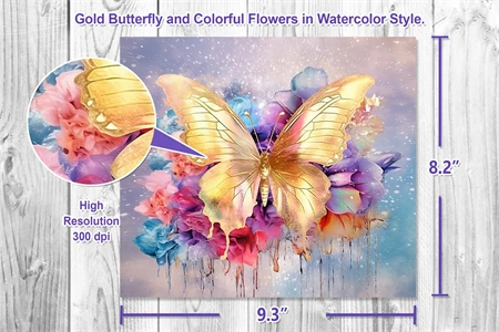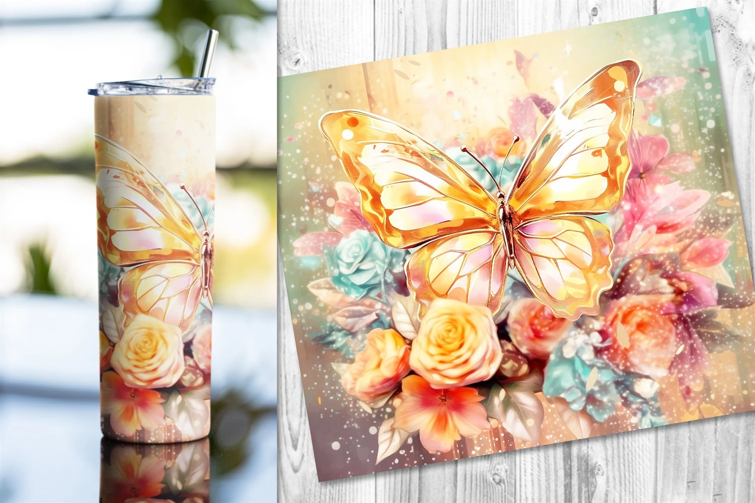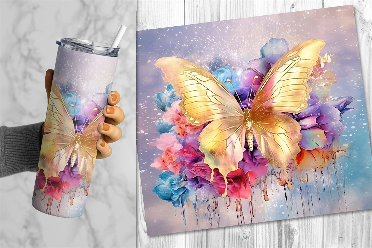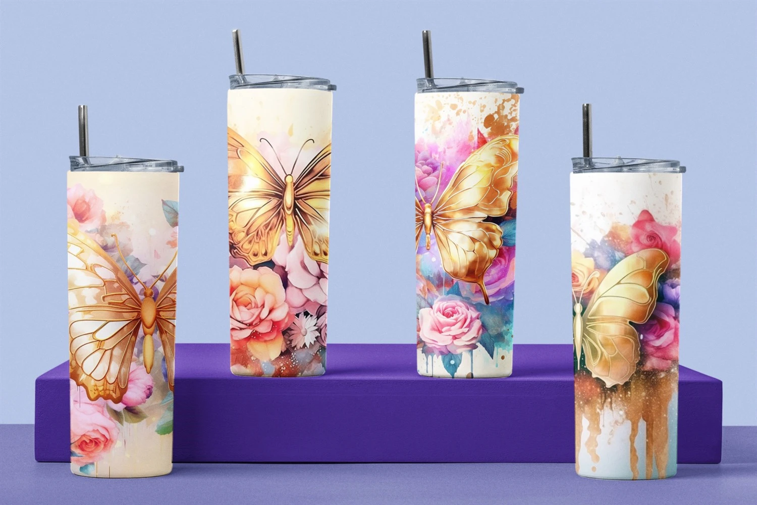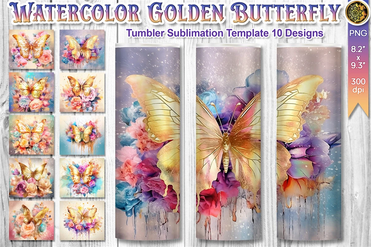 10 designs of gorgeous tumbler wrap sublimation with watercolor style gold butterflies and colorful flowers in different bright colors for straight skinny tumbler wrap. Perfect for the sublimation of skinny 20oz tumblers.