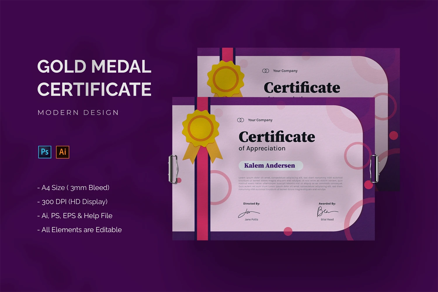 This is Gold Medal - Certificate Get it now!, This very professional, easy to edit, can be customized to your needs,(Adobe Illustrator,Adobe Photoshop). You can use this certificate for awards, seminars, training, tournaments, I hope you enjoy for this, Hope you Like it dont forget to rate, Thanks.