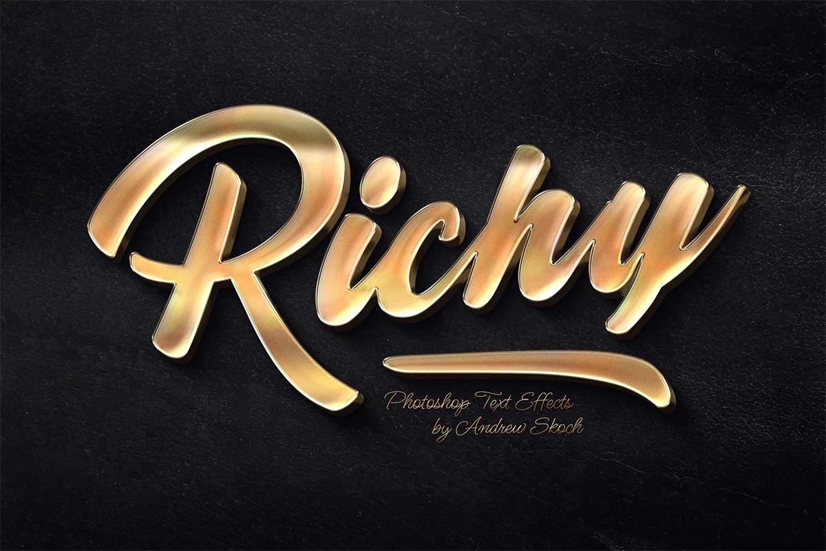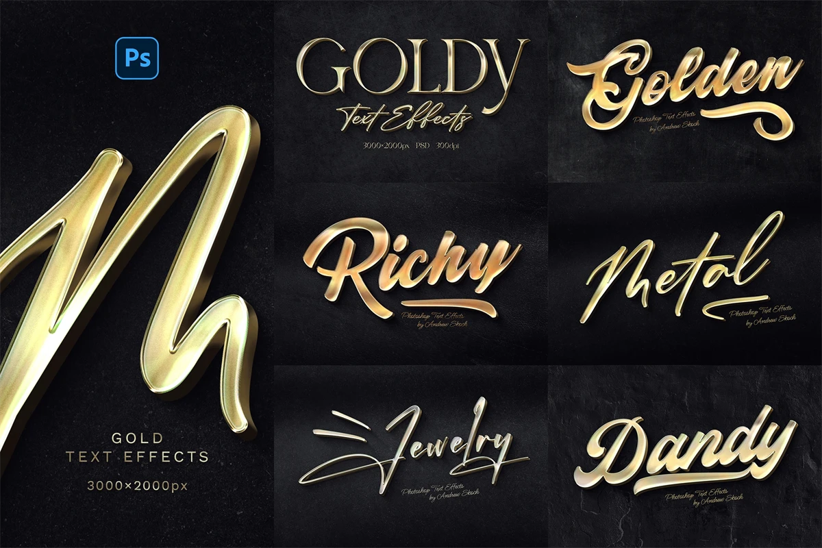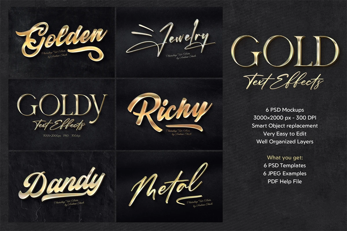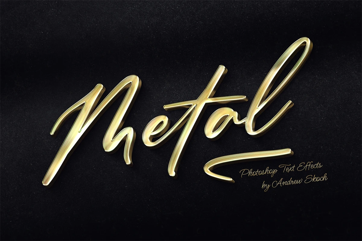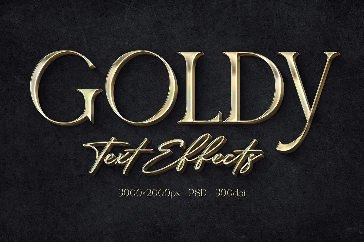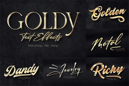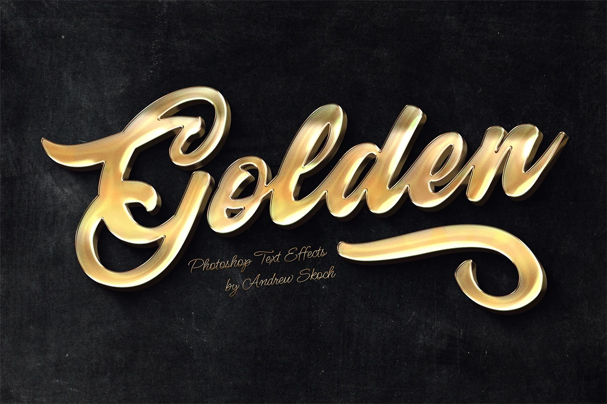 Metal gold effects for texts and logos. Its easy way to present your text, shape or logo in luxury style. Shining gold effects with long shadows on dark wall texture.