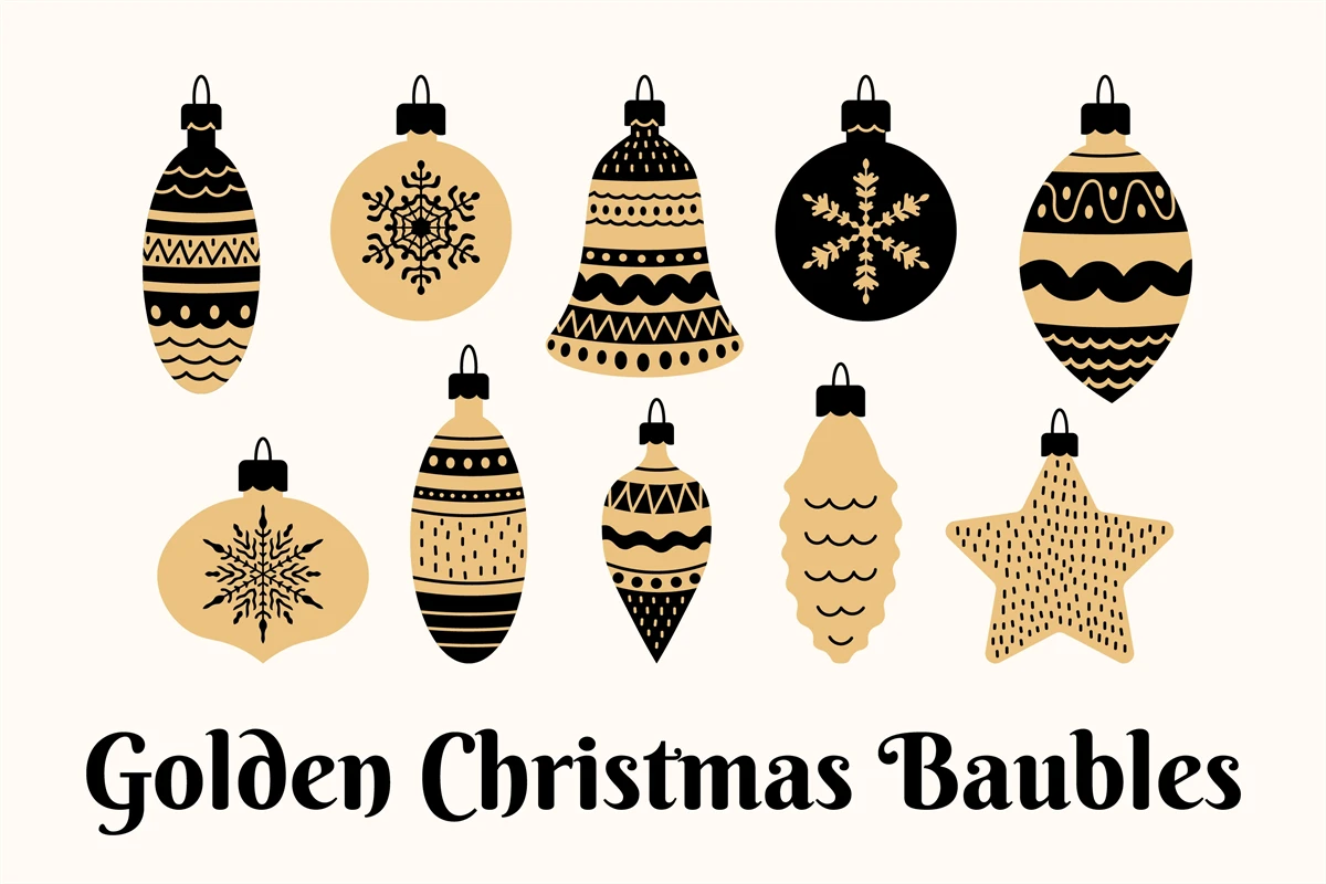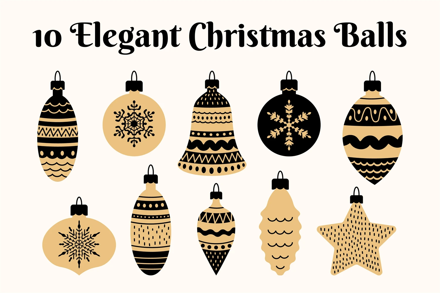 Collection of elegant black and gold colored Christmas balls with various shapes in flat and doodle styles. Christmas holiday design for greeting card, poster, stickers, sublimation, decoration, etc. Vector illustration.