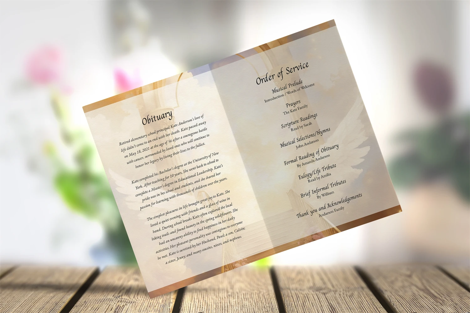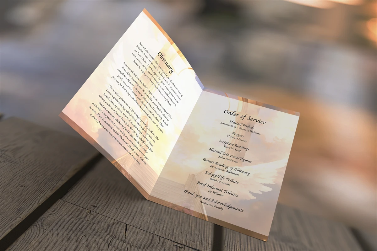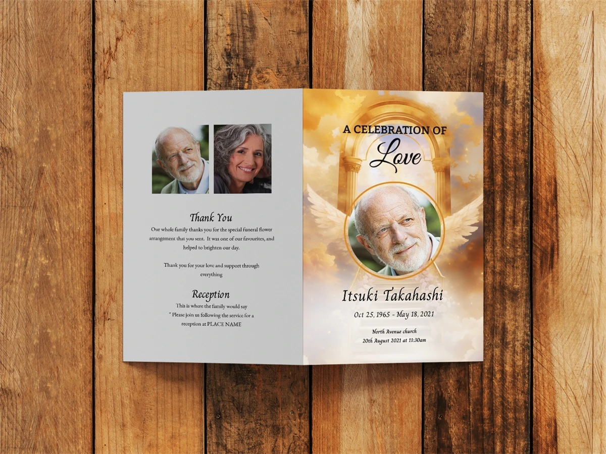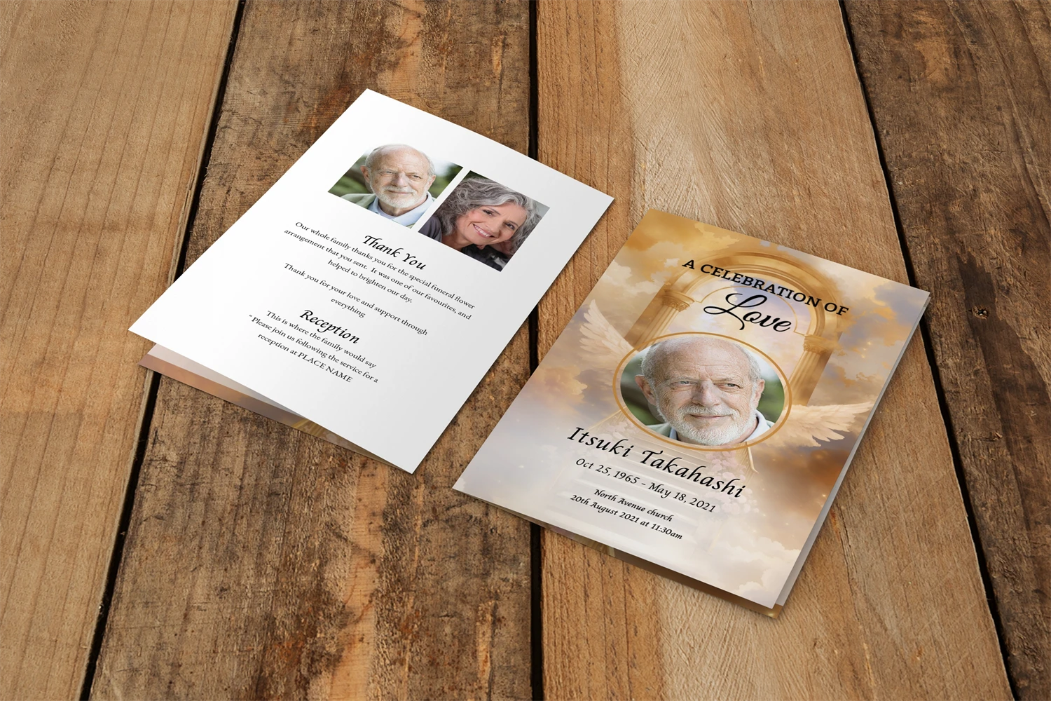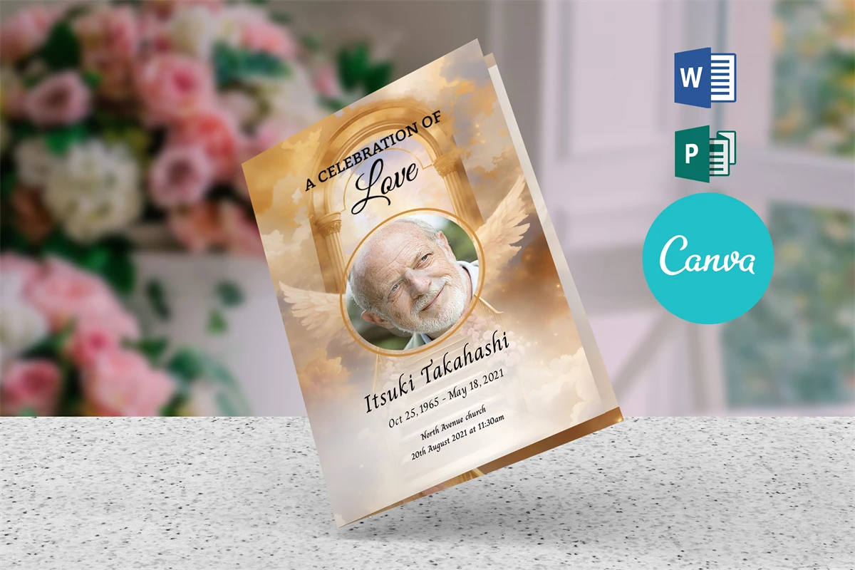 Create a heartfelt tribute with our Editable Golden Heaven Funeral Program Template, A customizable 4-page booklet for celebrating a loved one's life, available in Word, Publisher, and Canva formats.