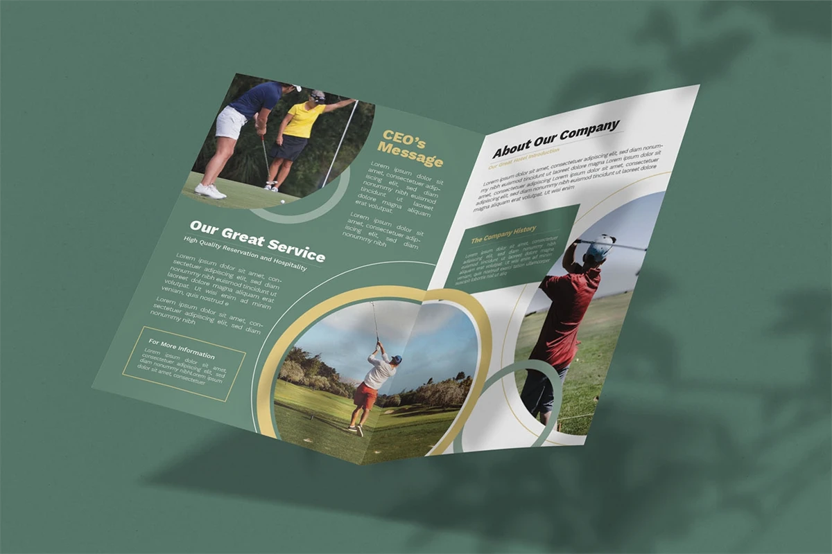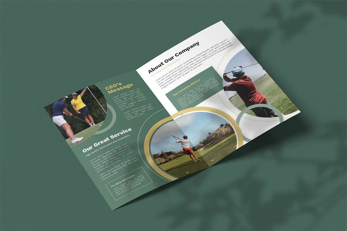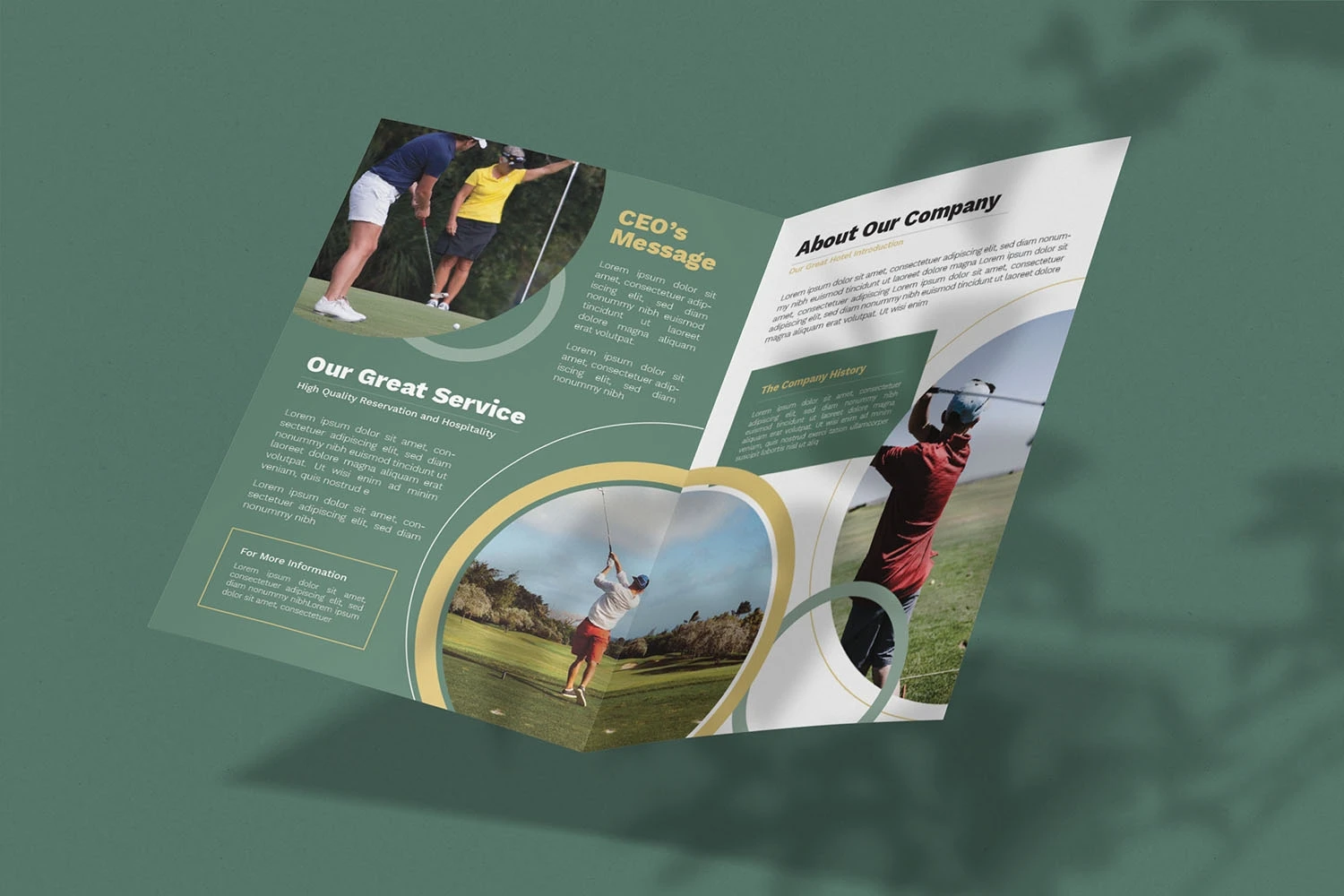 Golf Filed - Bifold Brochure We present this Bifold Brochure for you, simple and very elegant, and this Bifold Brochure is suitable for all types of your business, made with Adobe InDesign (INDD), Adobe Photoshop (PSD) and Adobe Illustrator (AI), very easy to customize, Hope you Like it, dont forget to rate, Thanks.