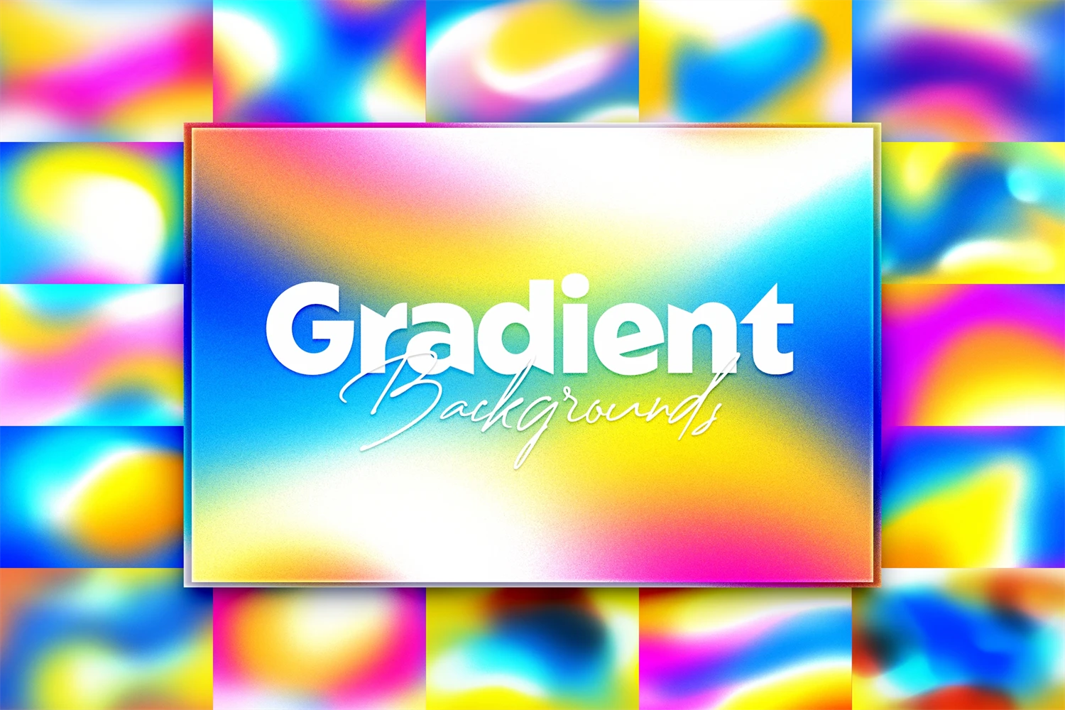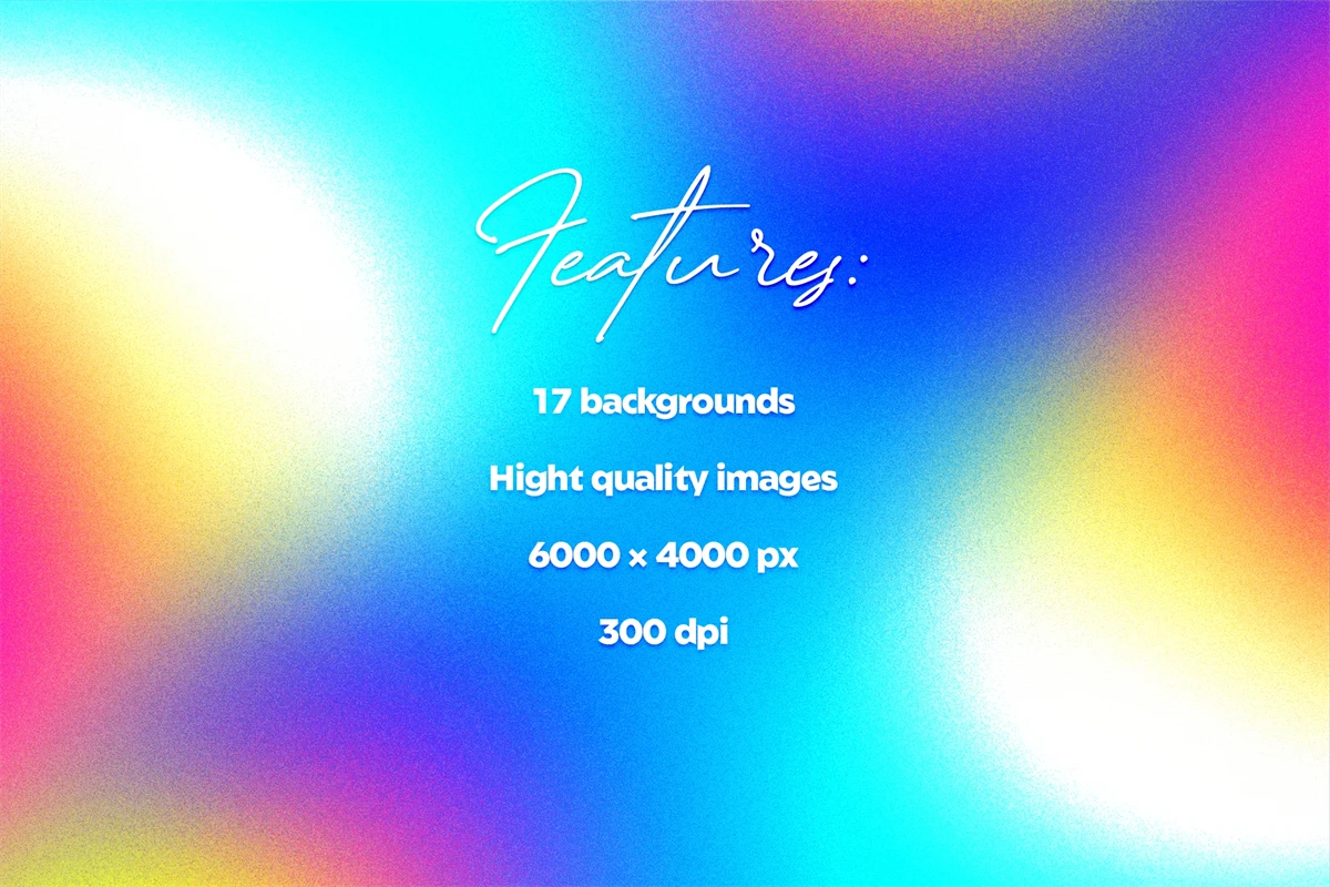 Collection of 17 gradient backgrounds. Use ready-made gradients with cool grain textures. Colorful, bright, juicy and rainbow colored backgrounds. Use them for commercials, web projects, social media posts and stories, ads, Instagram banners, Facebook stores, covers and much more!