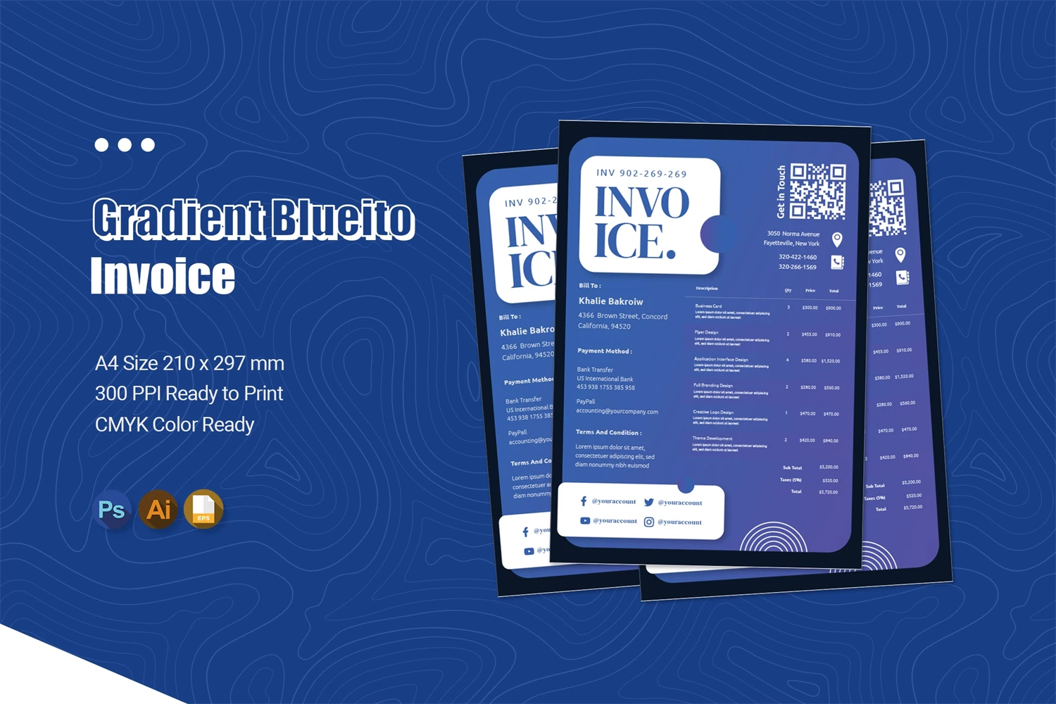 Use our invoices to make your bookkeeping easier and to impress your clients with an invoice display that has a modern, elegant design and strong typography. This invoice template is easy to use and customizable, making it perfect for any medium.