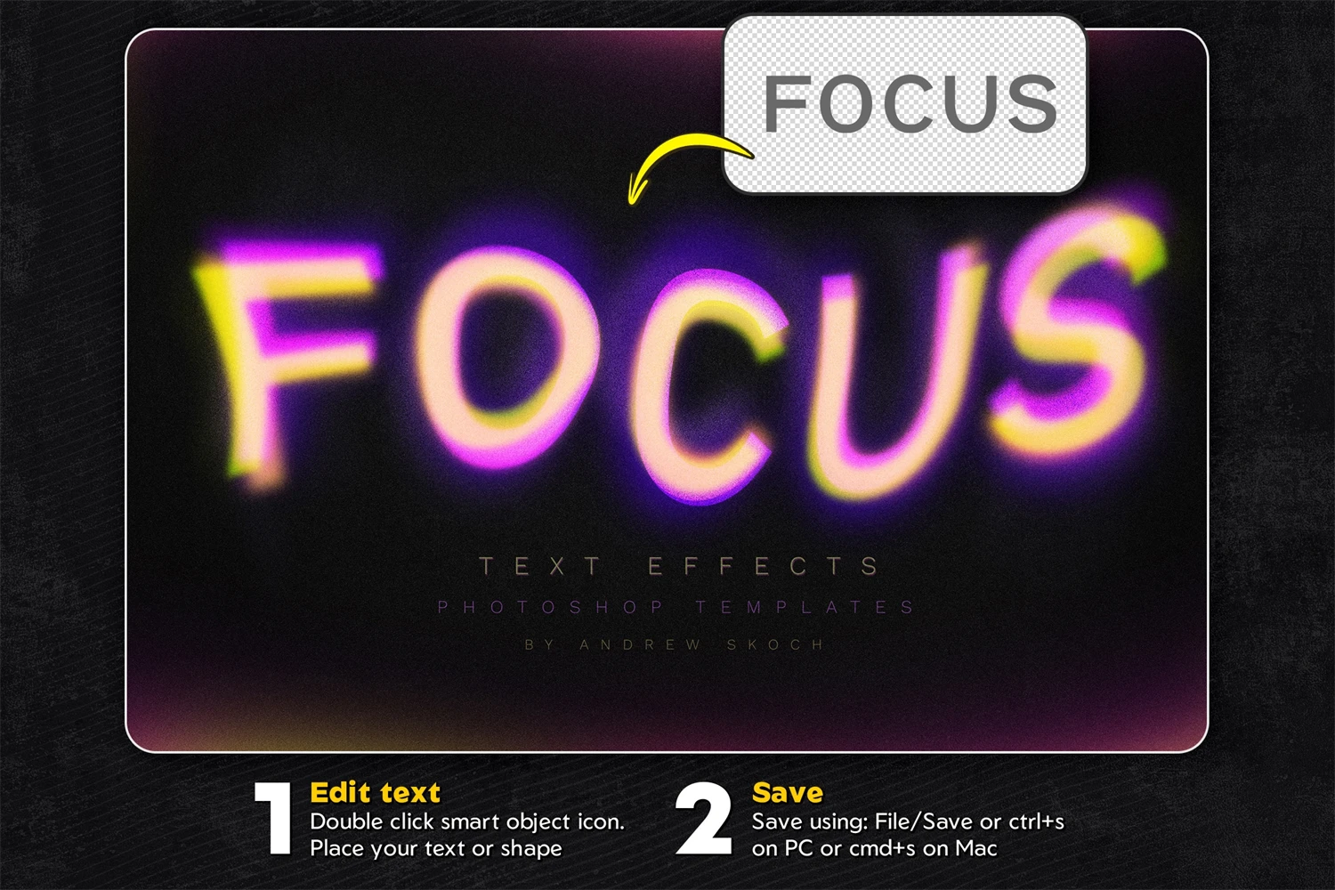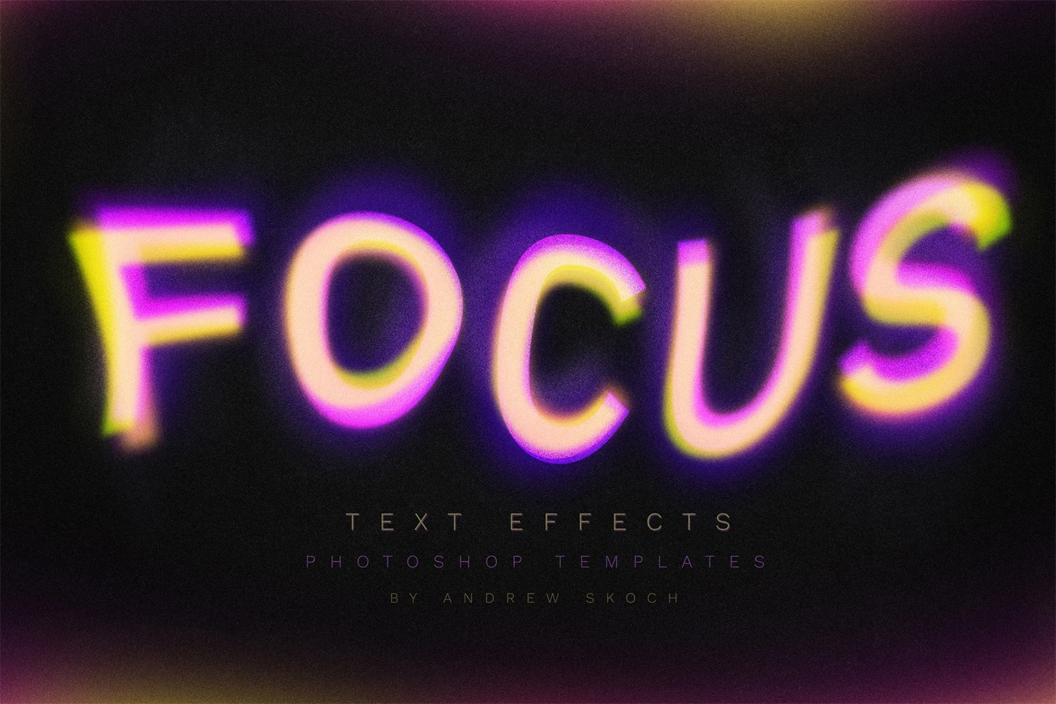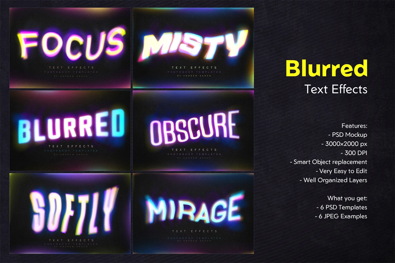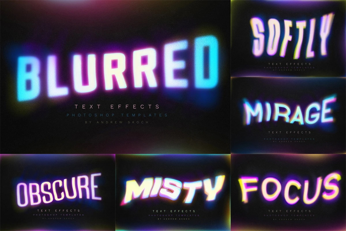 Collection of six Photoshop templates designed to create stunning text effects with gradient blurs. Each template offers easy editing capabilities, allowing users to customize text effortlessly using smart objects. These effects add depth and dimension to text, making it appear blurred yet stylish, suitable for various design projects.