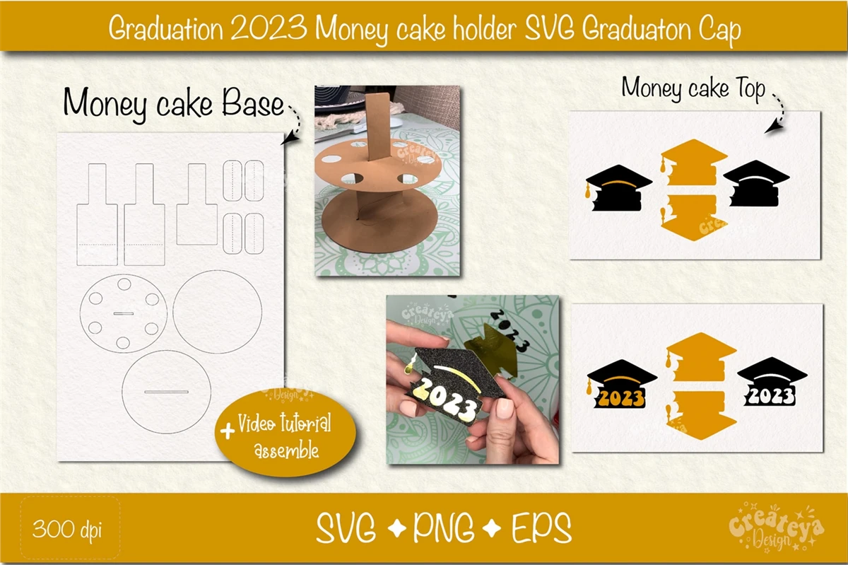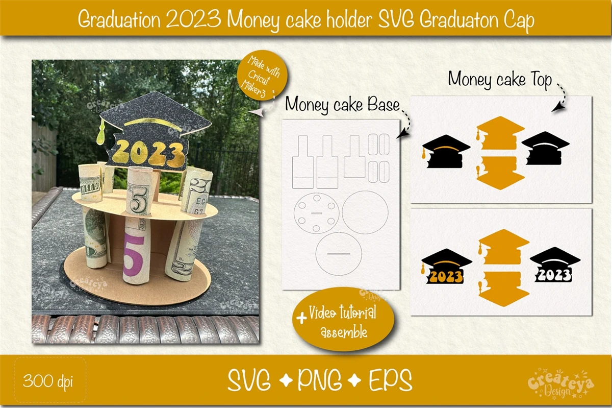 Graduation money cake SVG, Cardstock money cake template for Graduation 2023. Money holder SVG with 2 Graduation Cap Toppers Paper cutting. SVG template cut file for Cricut or other cutting machines.