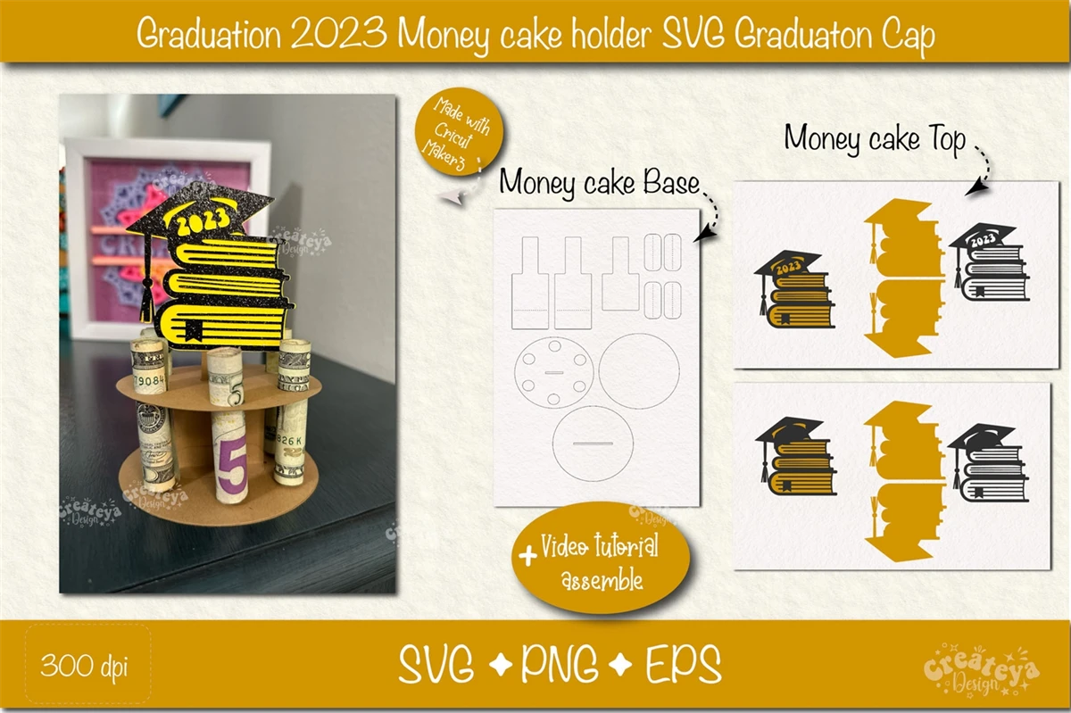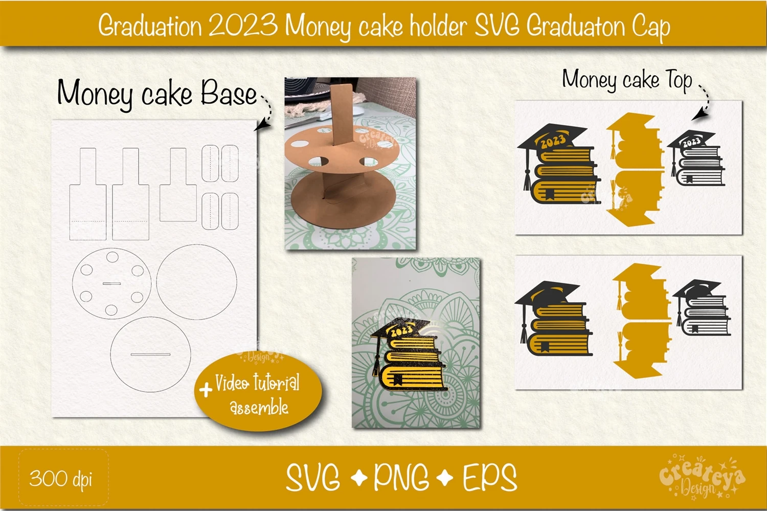 Graduation money cake SVG, Cardstock money cake template for Graduation 2023. Money holder SVG with 2 Graduation cap Toppers with 2023 and without. Paper cutting. SVG template cut file for Cricut or other cutting machines.