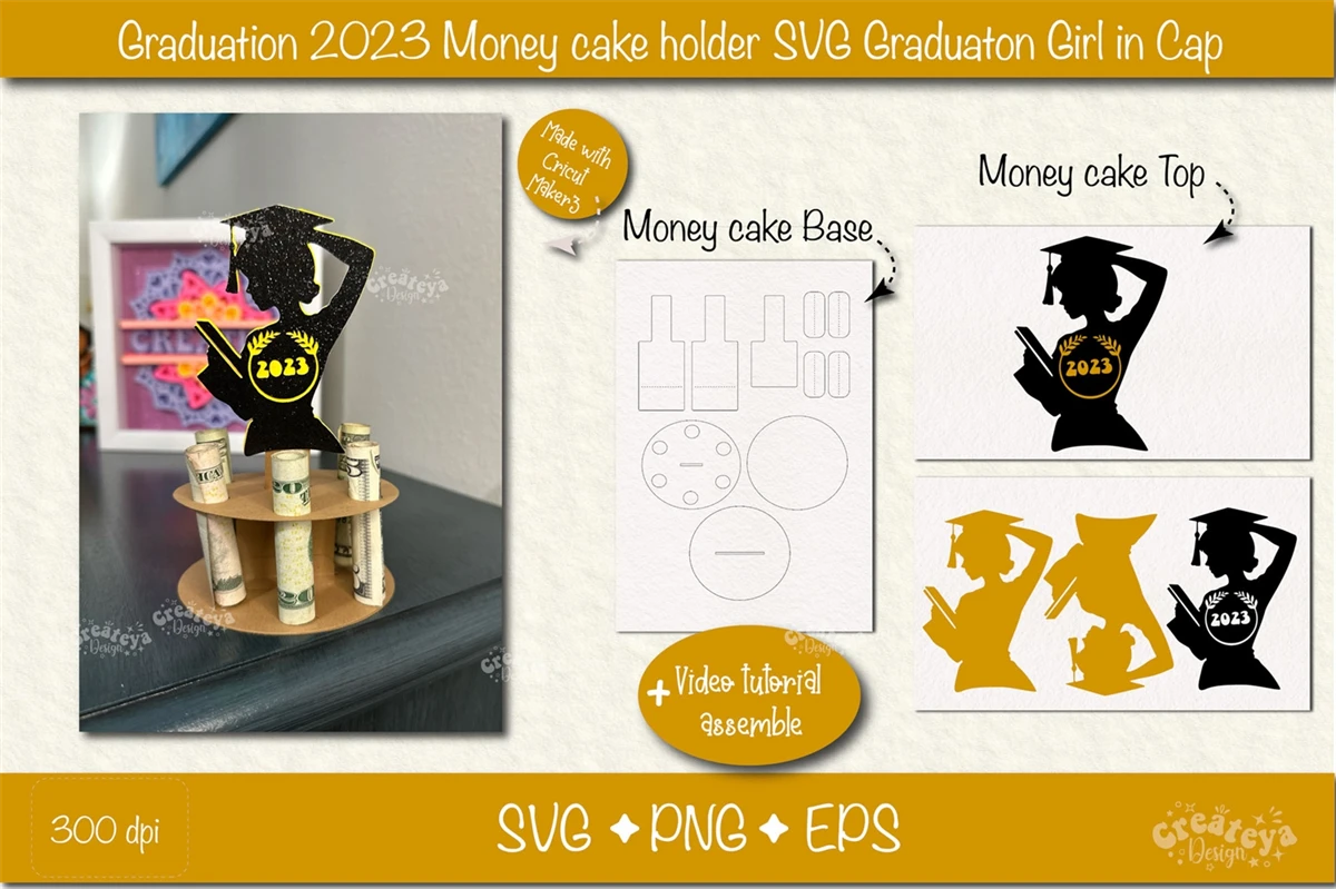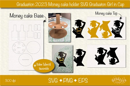 Graduation money cake SVG, Cardstock money cake template for Graduation 2023. Money holder SVG with 2 Graduation Girls Toppers with 2023 and without. Paper cutting. SVG template cut file for Cricut or other cutting machines.
