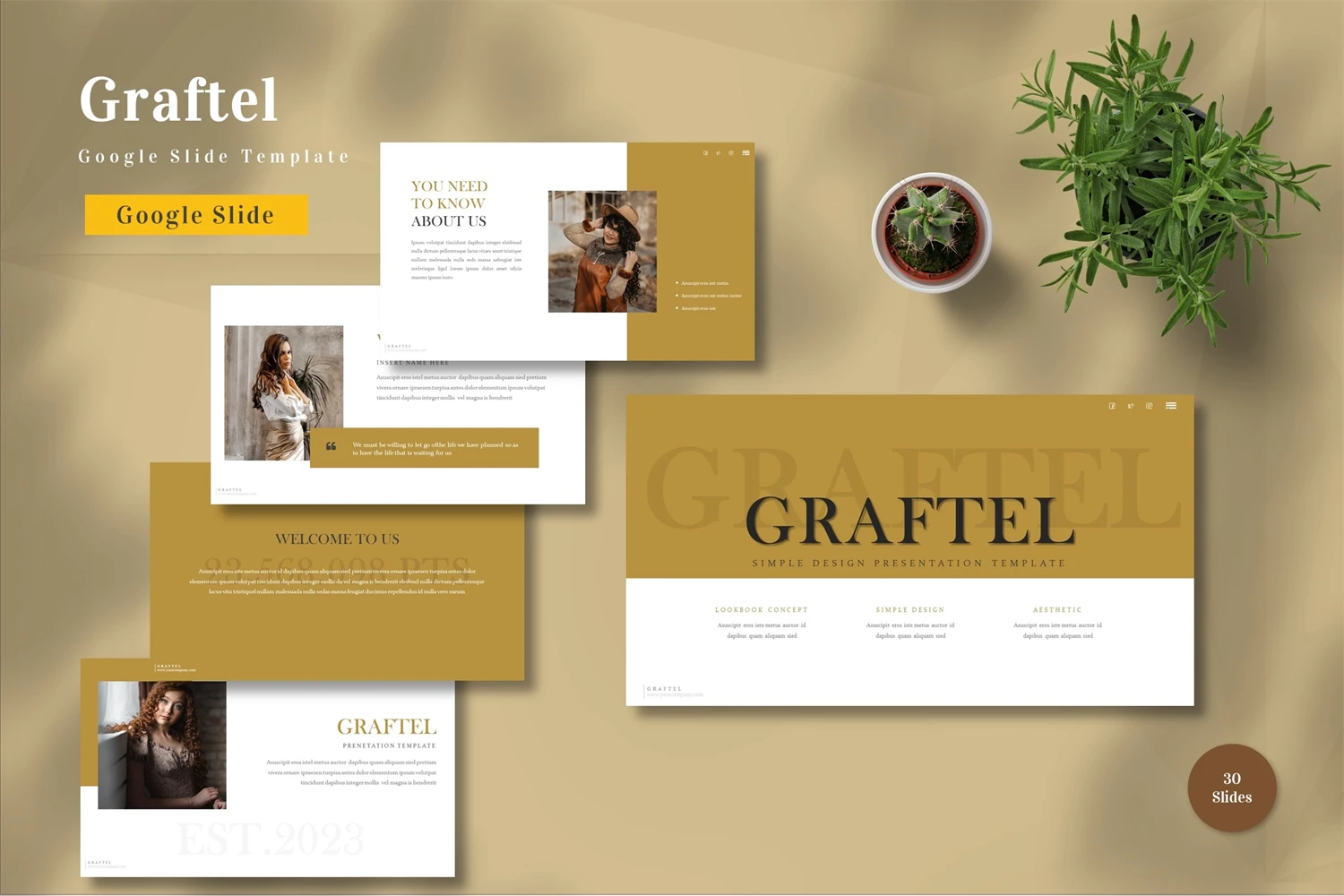 Get it now! **Graftel - Google Slide Template** for All Business and Personal Needs All elements on this template are editable; input your content, replace your image with a placeholder, change the color, and all presentations include an animated slide to present your slides.