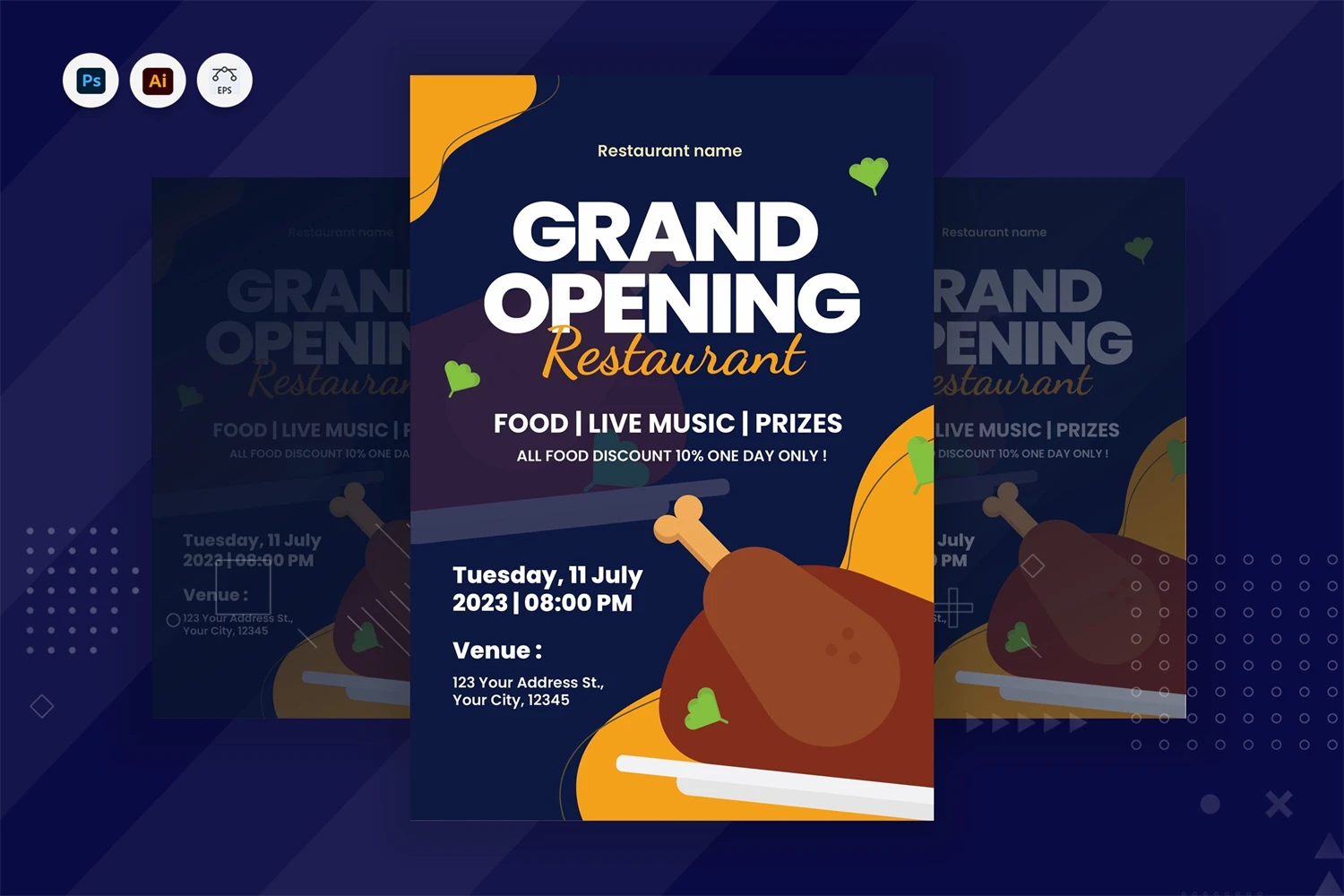 Here is our business Poster template! This is creative and corporate style Poster template, **Grand Opening Poster**- Get it now!,great Poster template for All business and personal needs. All elements on this template are editable from Ai & EPS tools, input your content, replace your image with a placeholder, change the color, and, all templates include professional layouts and present your template to the world. This design will great for promoting Specification